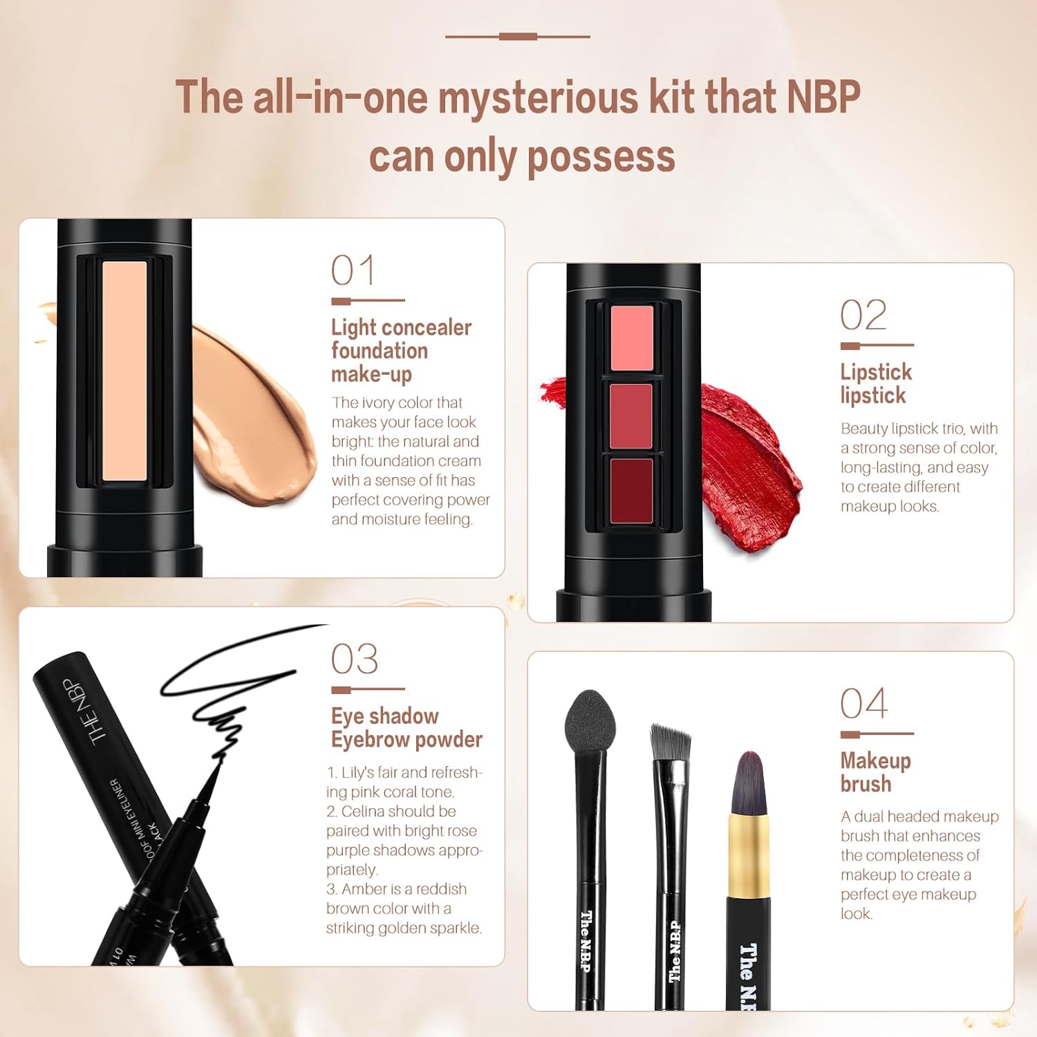 - Multi-purpose fashionable Makeup Kit Eyeshadow Palette: 3 colors eye shadow,3 colors lip gloss,1 color concealer, installed in a fashionable lipstick suit, with mirror, eyebrow pencil and eye shadow brush