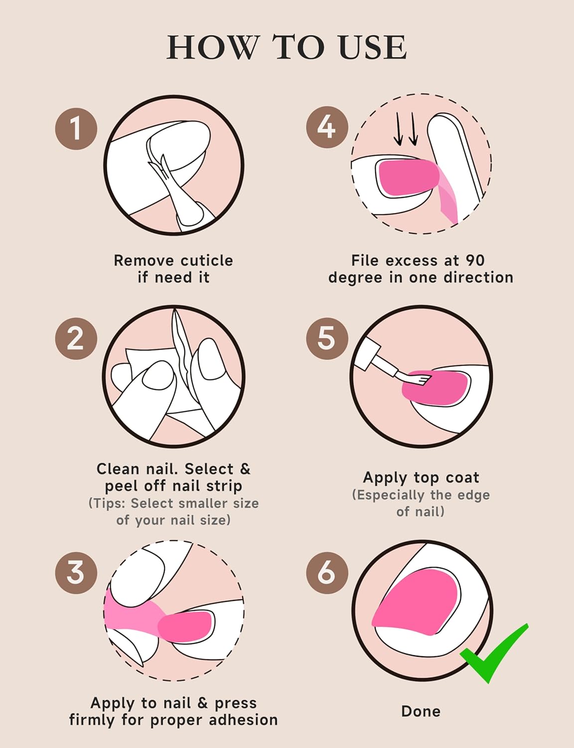 - What you get: 44 Gel Nail Strips, 1 top coat, 2 Cleaning Wipes, 1 Wood Stick, 1 Nail File, 1 Cuticle Trimmer. If customers are not satisfied with their purchase or having any problems, please contact us as soon as possible and we will reply within 24 hours with friendly customer service.
