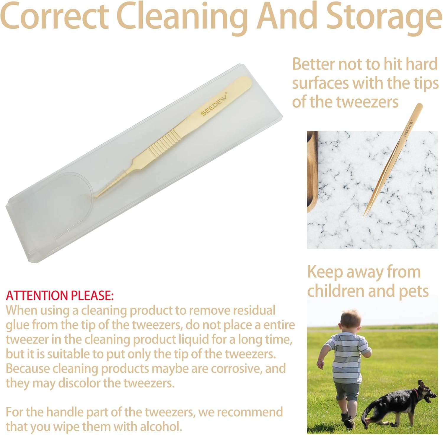 - âăPremium And ClassicăSEEDEW stainless steel golden tweezers have texture, smooth surface, classic and elegant style. 1 piece tweezer is equipped with a cover for the tip of the tweezer and a protective case, which is safe for storage, dustproof, dropproof, and imitation of poking.