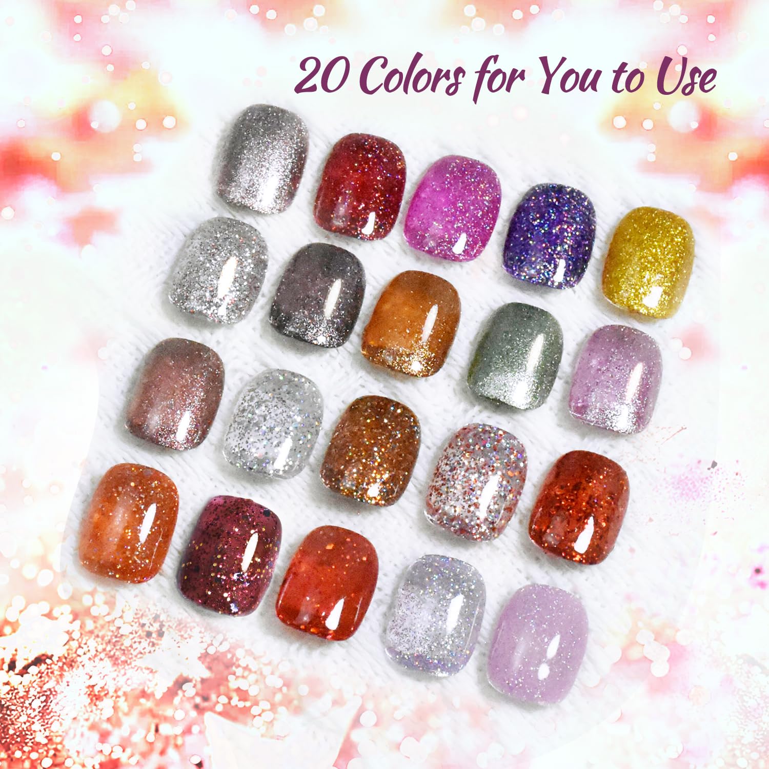 - Gel Set: 20 kinds of glitter coloured gels with different styles for DIY, they are suitable for home and nail salon.
