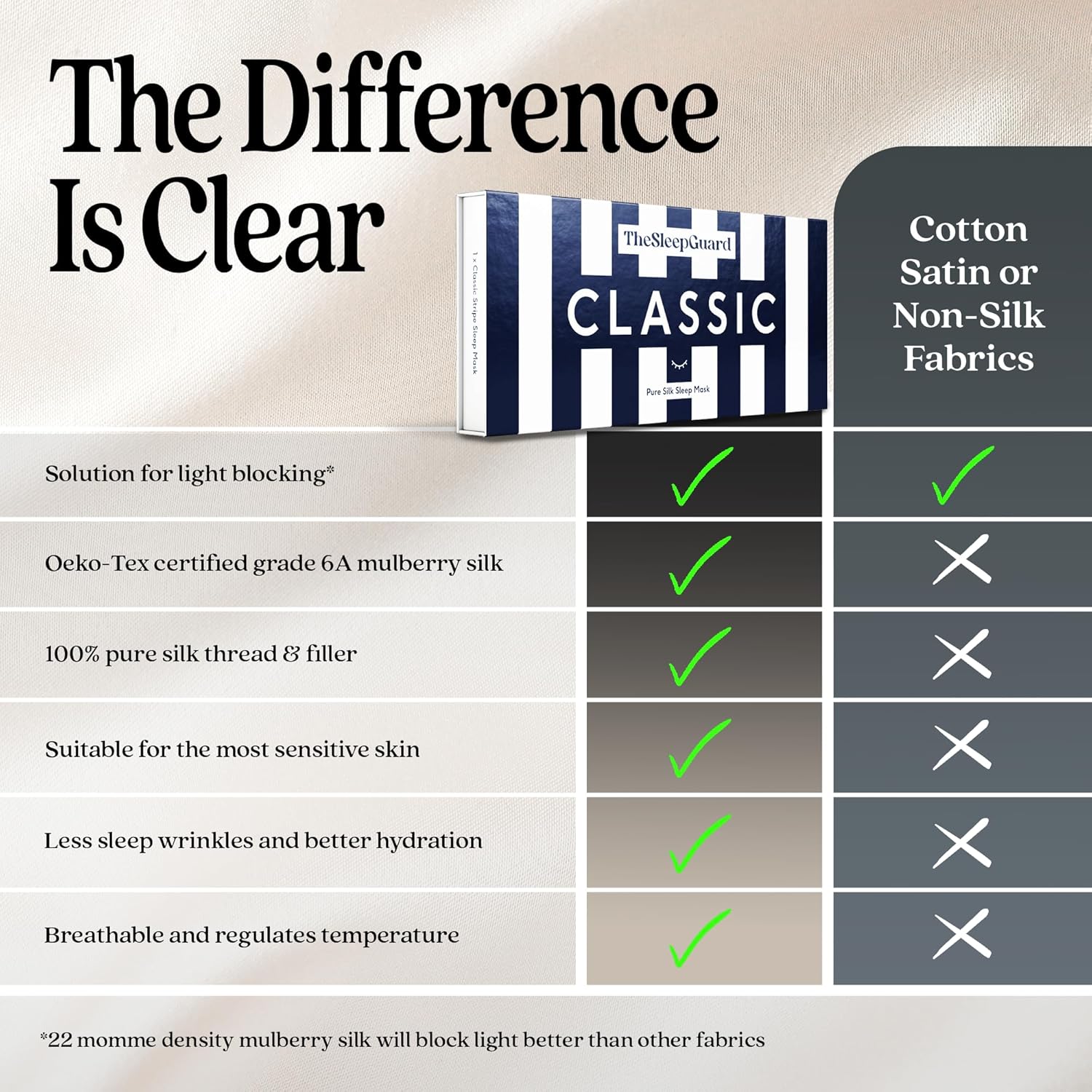 - ✅ INVEST IN YOUR SLEEP - Experience TheSleepGuard difference with our luxury sleeping masks. Crafted from the highest grade 6A Mulberry silk at 22 momme and certified by Oeko-Tex to ensure you sleep soundly. Remember, better sleep leads to a better you.