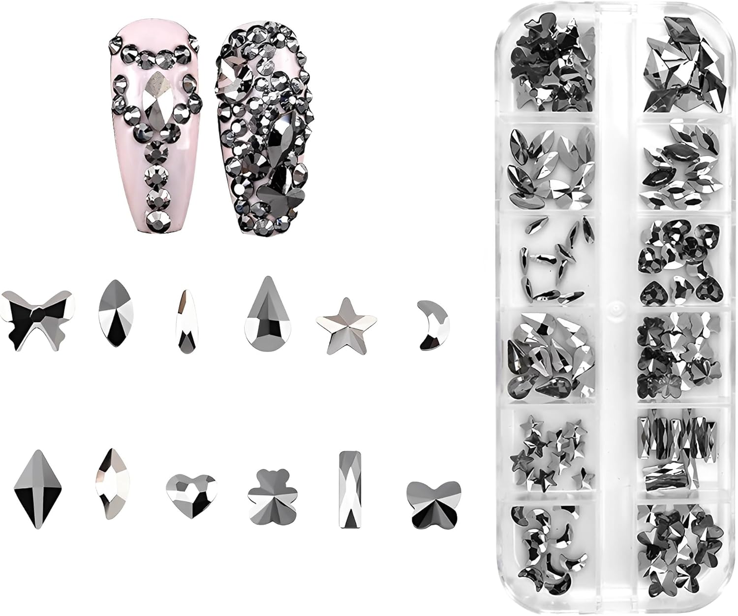 - Quantity: 120pcs Rhinestones totally, 12 shapes,10pcs for each shape.