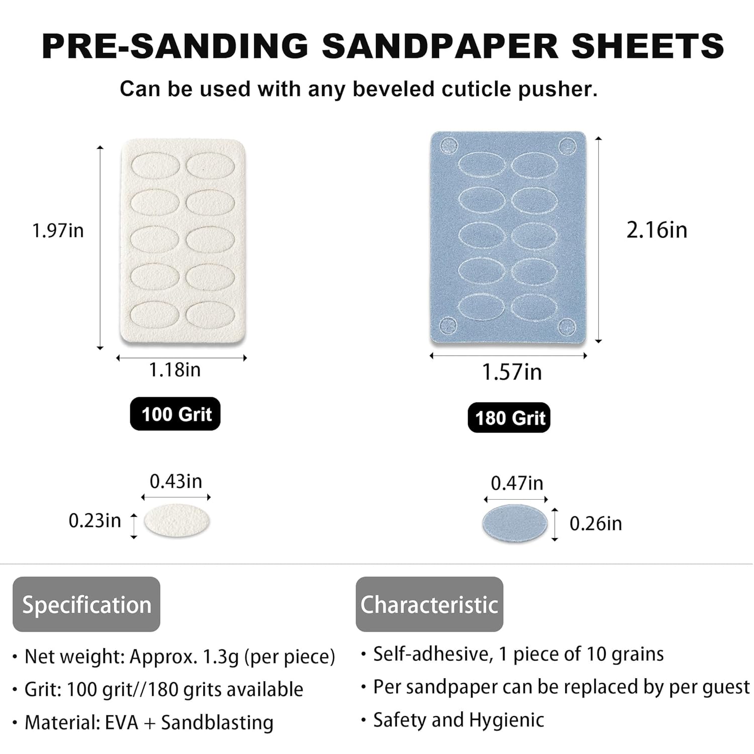 - Self-adhesive Mini Nail Files - The back of the nail file sandpaper is self-adhesive, very easy to use and replace, the mini sandpaper piece need to be used with cuticle pusher tool. These nail polishing sand papers are disposable, more healthy and hygienic.