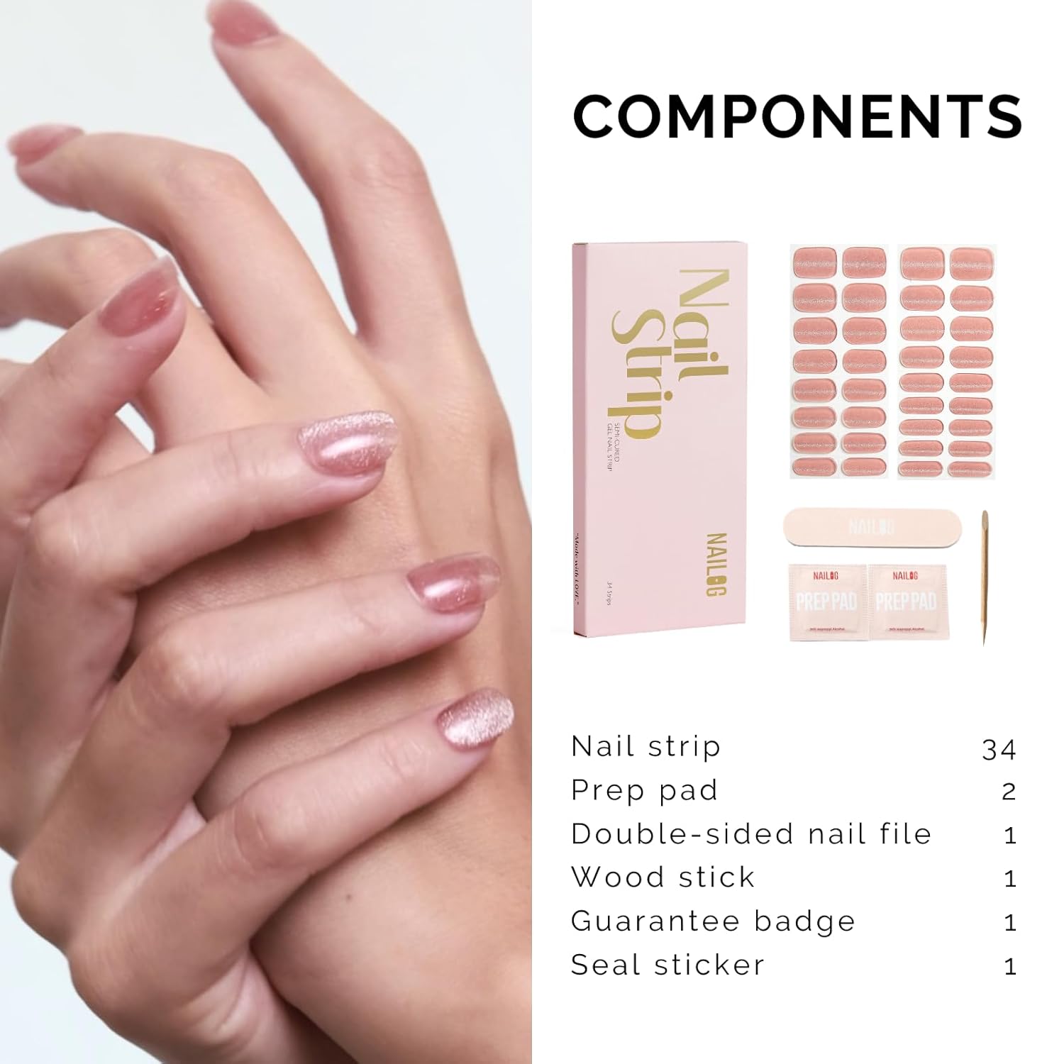 NAILOG Semi Cured Gel Nail Strips - 34 pcs | Buy 2 Get 1 UV Lamp | Long Lasting Nail Polish Sticker Wraps with Glossy Gel Finish, Pink Gleam