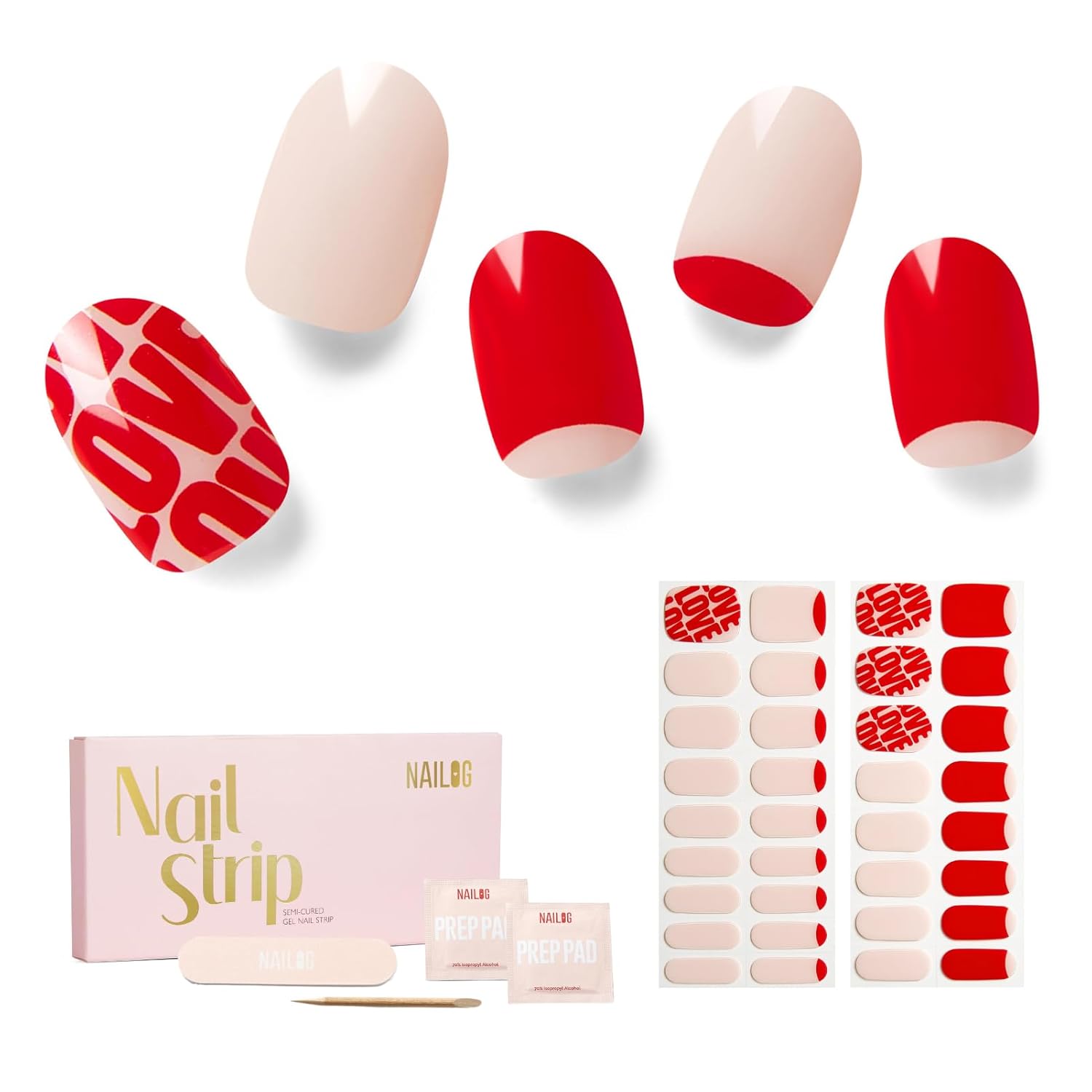 NAILOG Semi Cured Gel Nail Strips for Valentine's Day - 34 pcs | Buy 2 Get 1 UV Lamp | Long Lasting Nail Polish Sticker Wraps with Glossy Gel Finish, City of Love