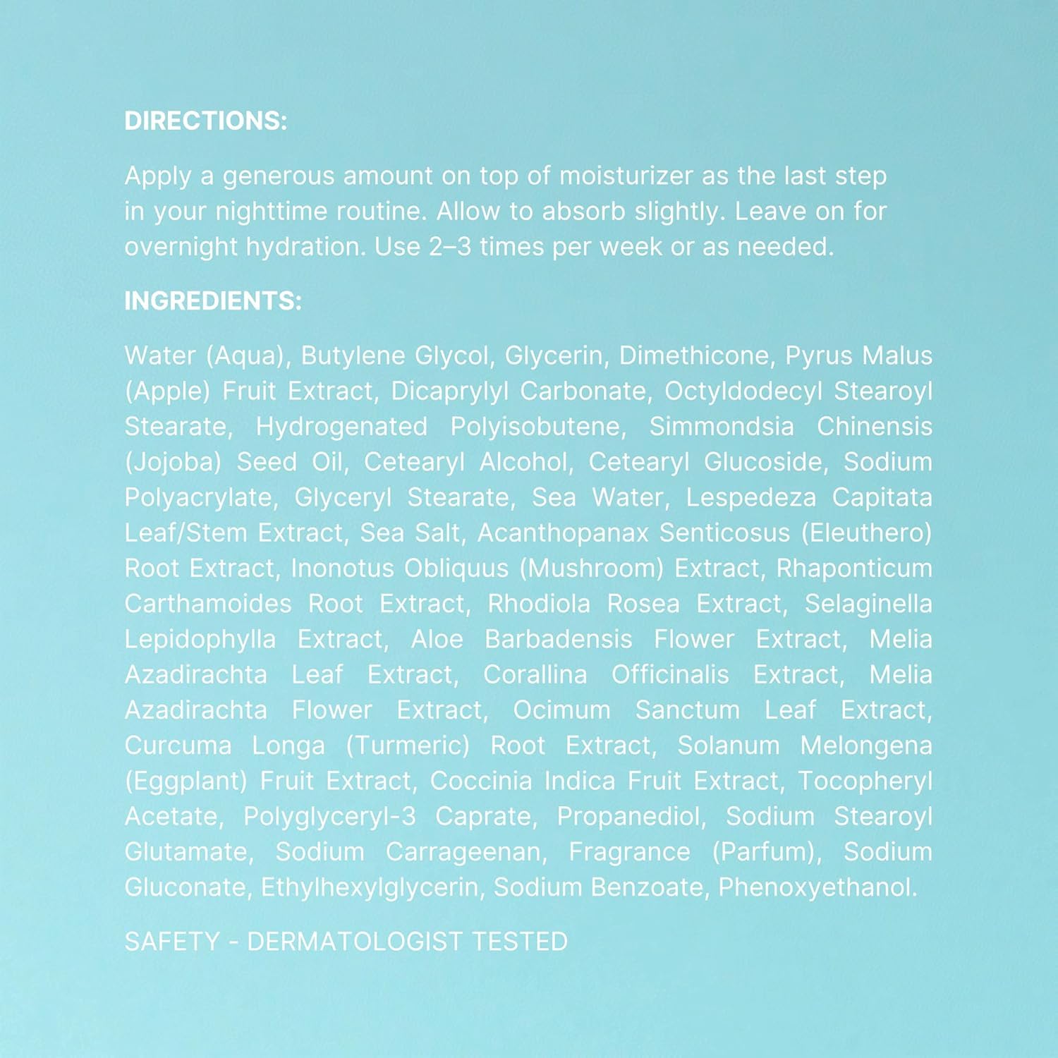 - Bioadaptive Botanicals: Infused with a blend of adaptogens including Rhodiola, Maral Root, Siberian Ginseng, and Chaga Mushroom, this mask helps your skin adapt and bounce back from daily Issues.