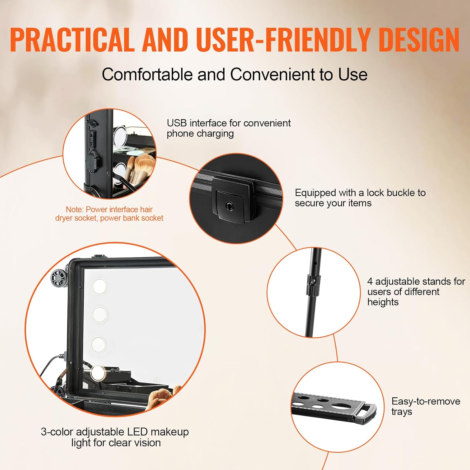 • User-friendly Design: The makeup case features a built-in full-screen mirror with 3 LED light colors, saving space and providing clear visibility. It has a USB interface for convenient phone charging, a lock buckle, and keys to keep your items secure. It also has adjustable support legs for the convenience of users of different heights, offering a comfortable and convenient user experience.