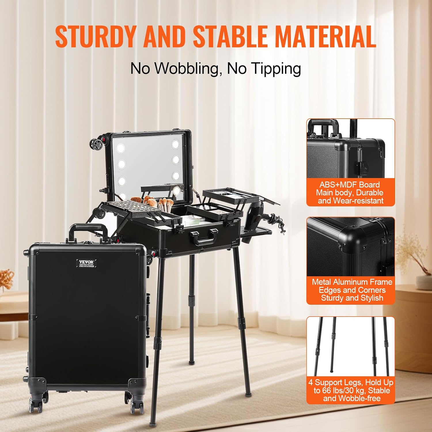 • Sturdy and Durable: The main body of the makeup case is made of ABS+MDF board, which is high-hardness and wear-resistant. The frame and corner connections are made of metal aluminum material, ensuring sturdiness and durability. The 4 support legs are strong and stable, capable of holding up to 66 pounds/30 kilograms without easily shaking or tipping over.