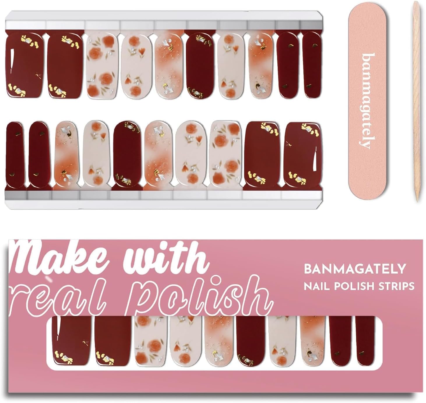 Nail Polish Strips, 20Pcs Salon Quality Gel Nail Stickers, Easy Long Lasting Wraps for Short Nails no UV Light Needed (Beautiful Roses)
