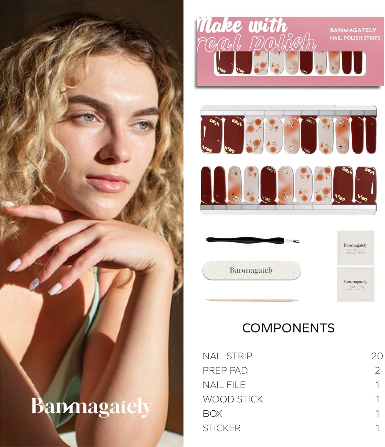 - Package Include: The whole product includes 20 pieces Water resistant Polish Nail Strips , 2 Cleaning Wipes, 1 Wood Stick, 1 Nail File, and 1 instruction manual.