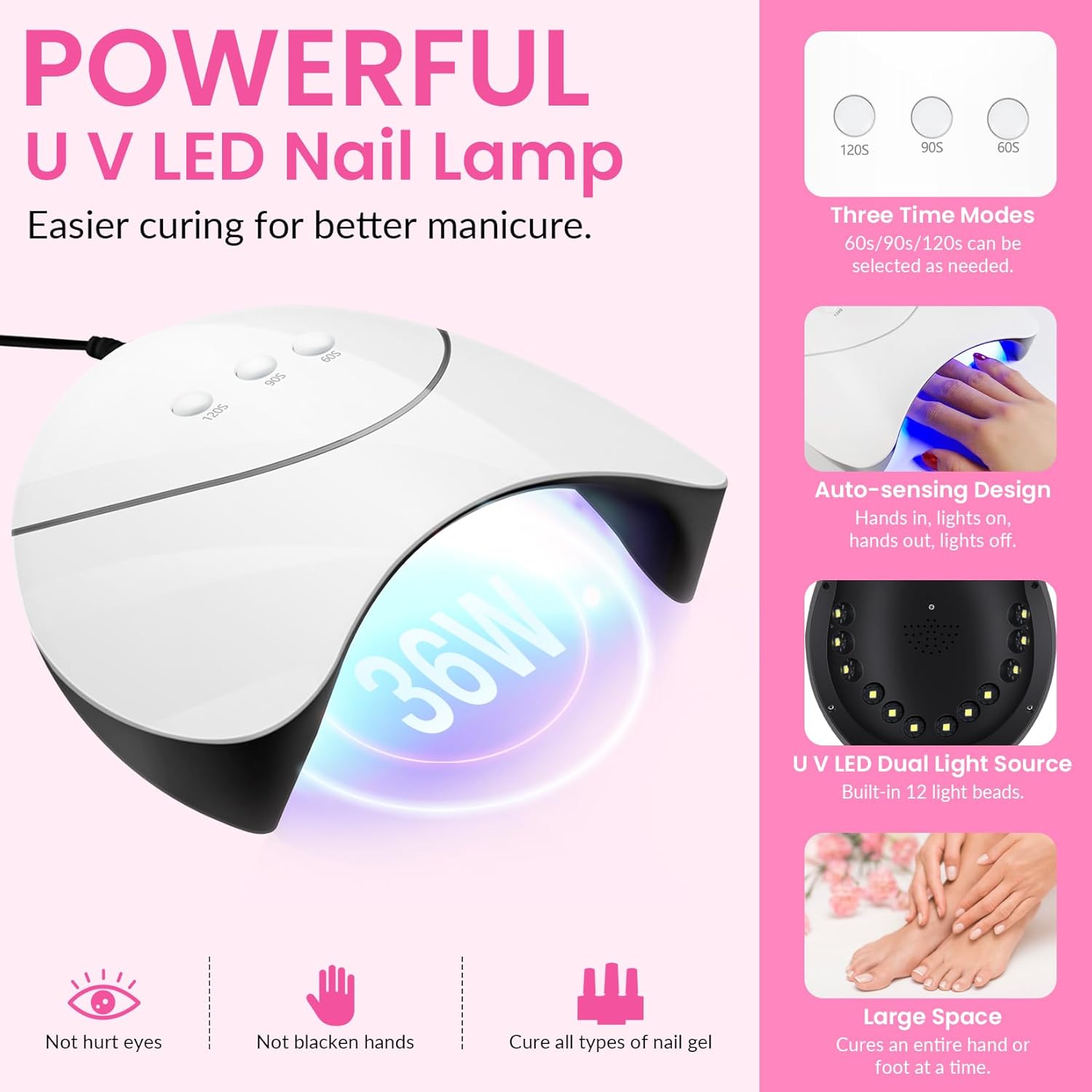 - 【Essential Nail Lamp for Cure】 Professional nail light in this gel nail polish kit has three time options: 60s/90s/120s, and automatic sensor design, allowing you to easily control the curing of gel nail polish. U V/LED dual light source design, with 12 lamp beads, can efficiently cure almost all kinds of nail gels, not hurt your eyes, not black hands. Enough space to cure a whole hand or foot, bring you high quality nail art curing experience.