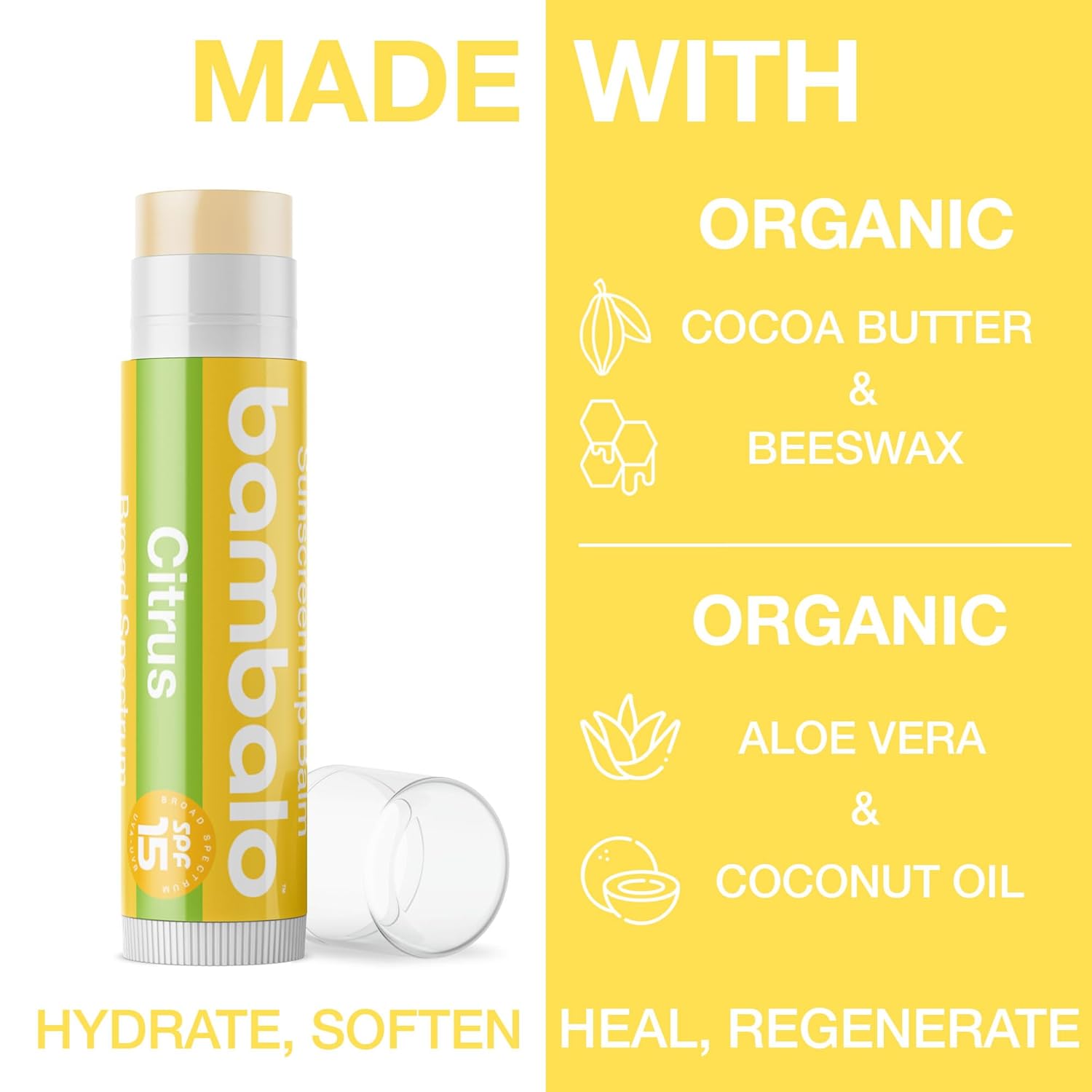 4-Pack Citrus SPF 15 Lip Balm - Organic Ingredients, Broad Spectrum UVA/UVB Protection - Hydrating & Moisturizing, USA Made