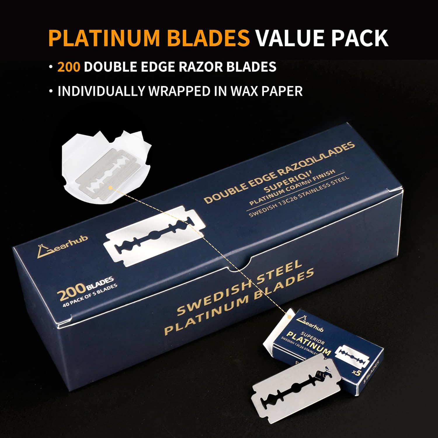Gearhub Premium 200 Count Double Edge Safety Razor Blades Refills Swedish 13C26 Stainless Steel Platinum Coated, Mild to Medium Sharpness for Smooth Shaves