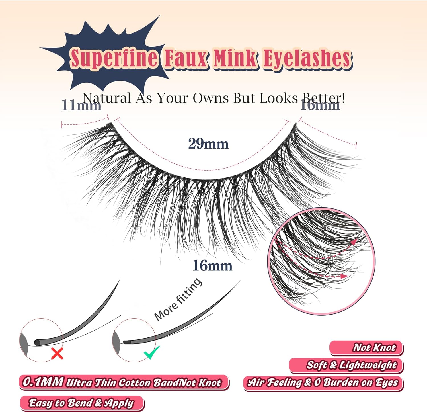 - CAT EYE LASHES NATURAL: Length: 11 mm -16 mm, glasses friendly. Flared longer length at outer of the eyelashes, extend your eye shape and lift your eye, creating a lengthening and lifting eyes effect, give you a charming effortless makeup look in daily life