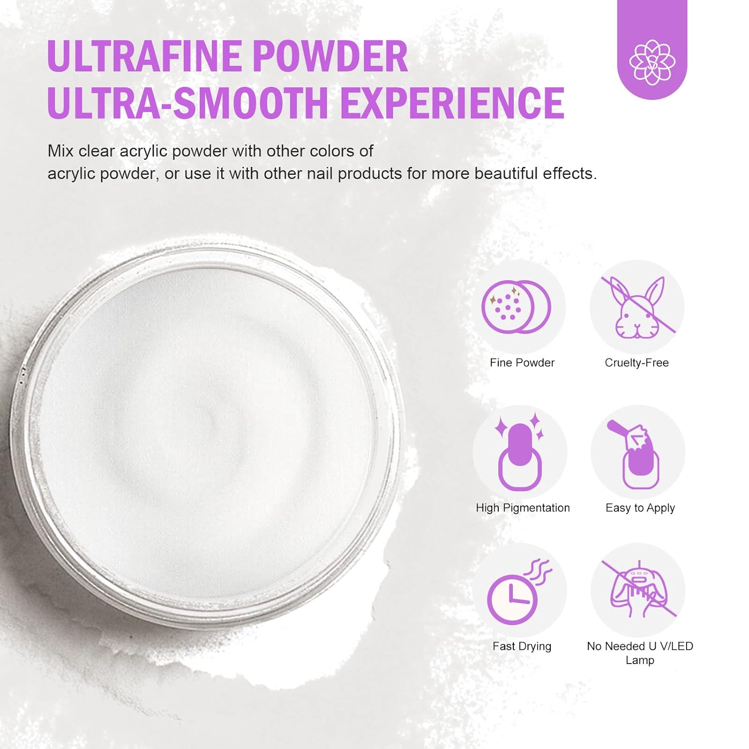 - Versatile Clear Acrylic Powder: Bubble-free ultra-clear acrylic nail powder is perfect for nail extensions, repairs, 3d carvings and decoration. Blends seamlessly with other colors for gradient effects, overlays and natural-looking, long-lasting acrylic nails