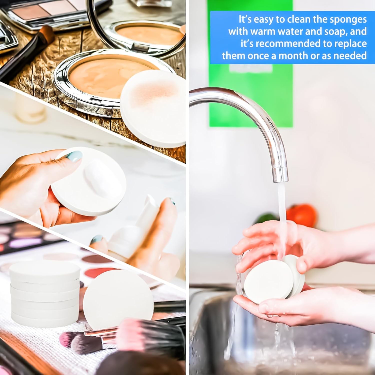 - Features: Makeup sponge round foam pads are soft enough to catch every area that needs to be covered, they are flexible enough to go deep into the corners of the eyes and soft to the touch for a smooth, even base. It's easy to clean the sponges with warm water and soap, and it's recommended to replace them once a month or as needed