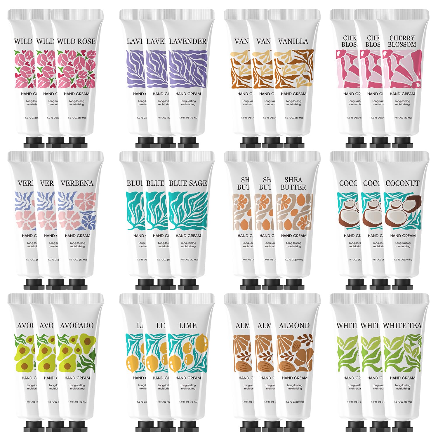 - 36 Pack Plant Fragrance Hand Cream:Shea Butter, Coconut, Avocado, Wild Rose, Lavender, Almond, Cherry Blossom, Verbena, Lime, Vanilla, Blue Sage, White Tea. Pick and choose your favorite scent based on your mood at the moment from our 12 natural fragrances