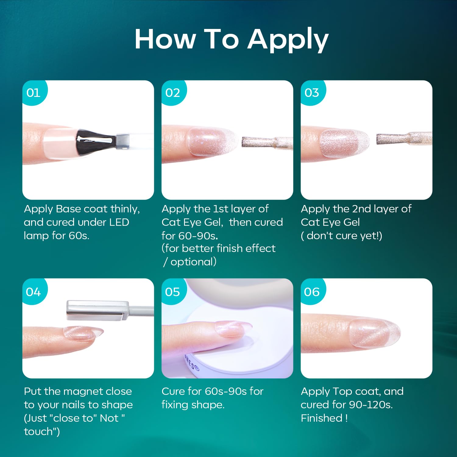 - Fashion Cat Eye Gel Polish Set: 6 Colors of blue green glitter cat eye gel nail polish set (7ml each) + 1 double-head magnetic stick for various cat eye designs.Infused with reflective glitter pigments for intense 9D cat eye effect under LED light