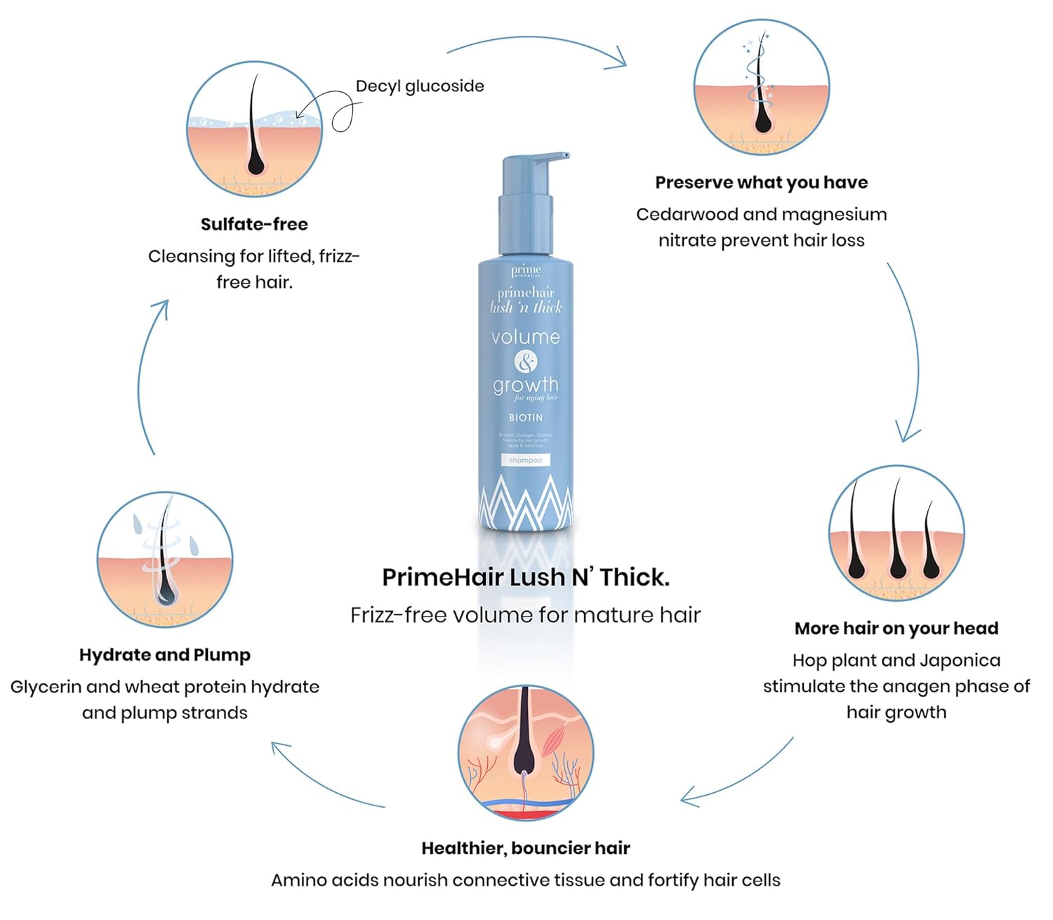 PrimeHair Lush N' Thick Shampoo for Mature Women – Biotin Enriched, Sulfate-Free and Paraben-Free Shampoo with Hair Growth Promoting Ingredients – Volumizing, Hydrating