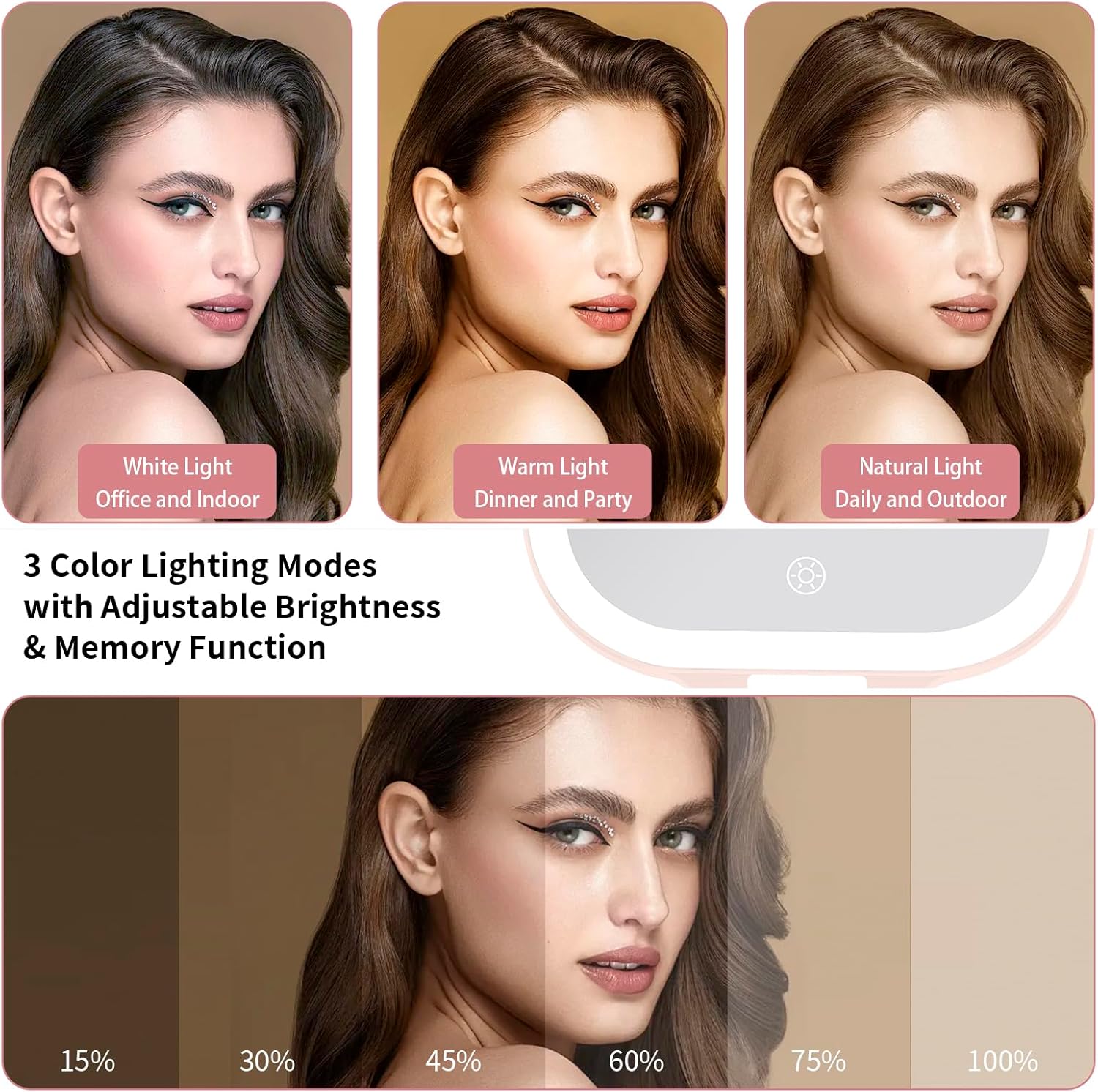 - Smart Touch-Sensitive Control and Memory Function: The vanity mirror with LED lights has three built-in color temperature modes, providing white light, warm light, natural light and brightness adjustment. The light is soft and can cover every corner of your face. Single-click short press to turn on and change the light color, single-click long press to adjust the light brightness, to meet all your needs in different environments. This wall mounted magnifying mirror also has an intelligent light memory function, which can easily use the last adjusted brightness, helping you quickly get the most suitable brightness and create a perfect makeup
