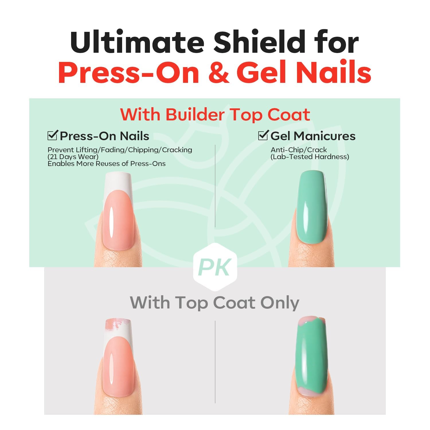 - 【Modelones Builder Top Coat】Modelones 15ml no wipe rubber top coat gel can long lasting for 21+ days which provides a strong and flexible finish, ensuring your nail extensions or wearable nails stay intact and flawless for longer periods without chipping or peeling