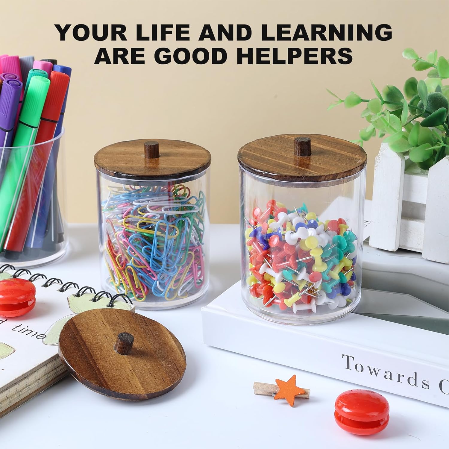 - WIDE APPLICATION STORAGE JARS: These cotton ball holder with lids are perfect organizer for small items, like Q-tip, cotton ball, cotton swab, cotton rounds, floss picks, tampon, bath salts, hair tie band, makeup brush, beauty egg, face brush, crayons, candy, pens, clip and more small things.