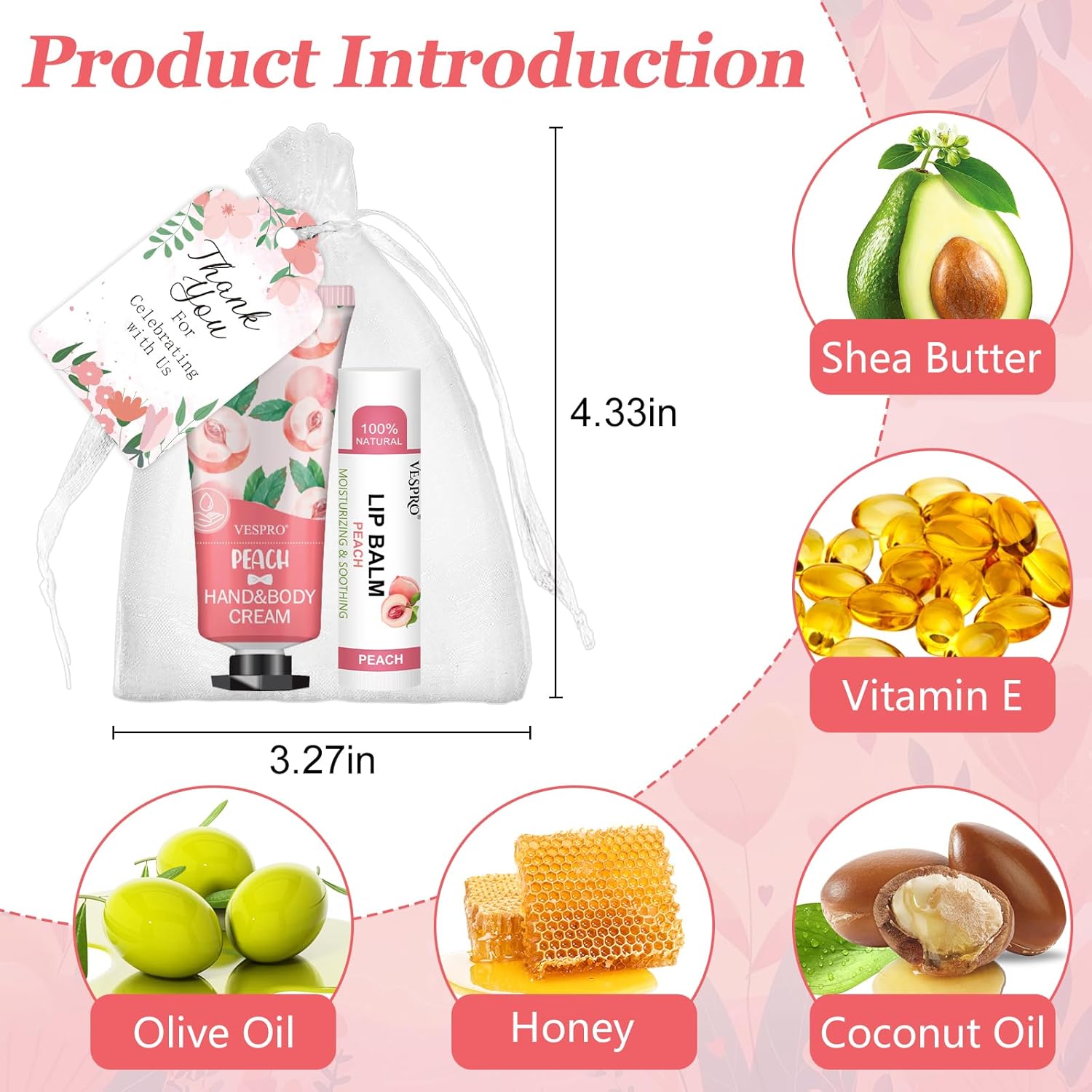 - 【Unique Party Favors for Guests】Our hand cream bulk and lip balm bulk set have 5 different fragrances - Lemons,grapes,peaches,aloe and honey.In addition,5 different colors are perfect for weddings and party,these thank you gifts can be distributed as gratitude gifts to guests and coworkers.