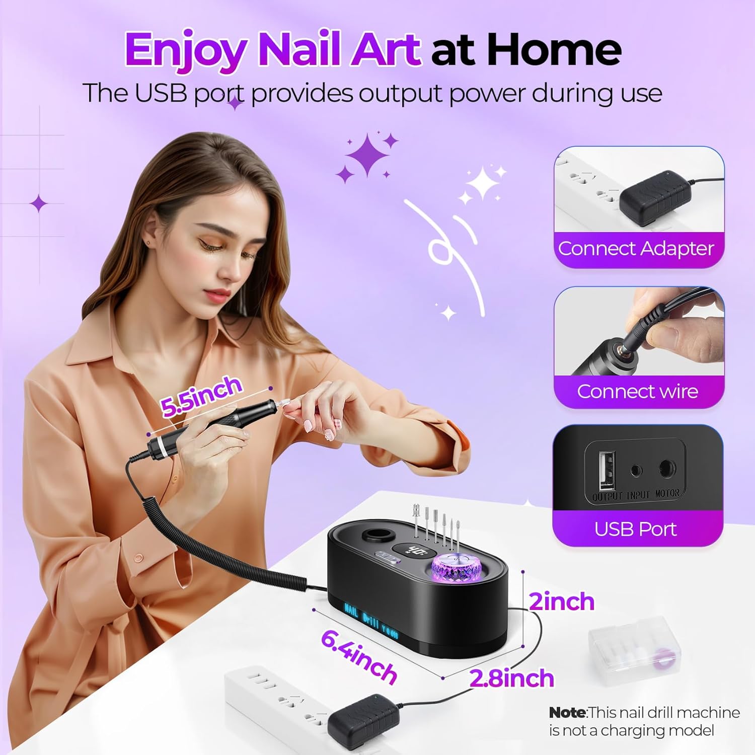 - Electric Nail Buffer & Complete Kit: This kit consists of 1* nail drill machine, 1* nail drill pen, 1* US dapter, 1* connecting line, 12* drill bits, 6* sanding bands, 1* use manual, everything you need for efficient nail care. The GOLEEXU nail drill is the best choice for you to do your nails.(Note: The GOLEEXU electric drill corded is not a charging model)
