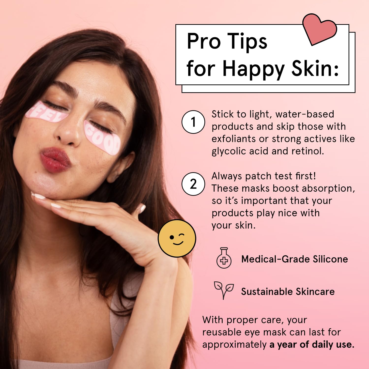 - Use Up To a Year - Keep glowing again and again with our reusable eye mask. With proper care, these medical-grade silicone eye patches can last for approximately a year of daily use. Just rinse after use and store in the cute tin case. A sustainable way to care for your under-eyes.