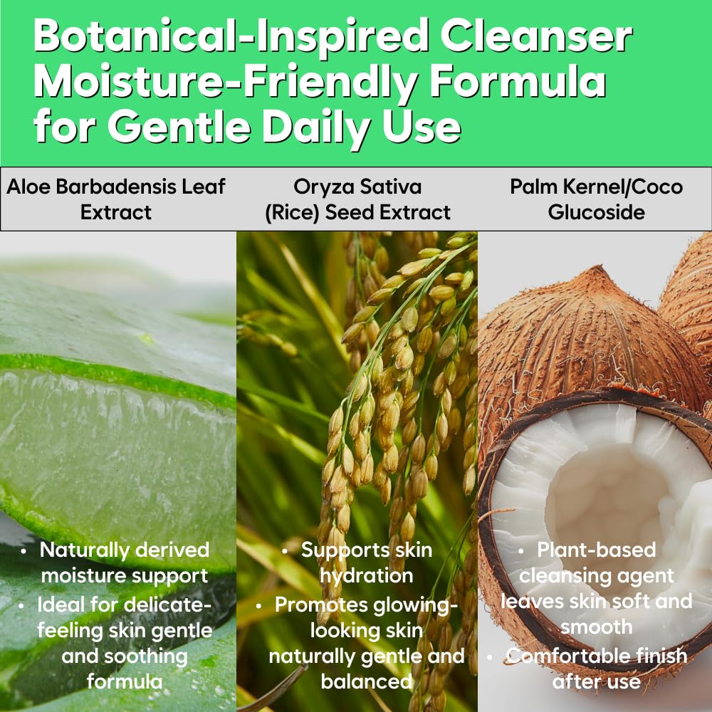 - HYDRATING ALOE VERA & BOTANICALS: Infused with Aloe Vera to replenish moisture and blended with rice, oat, carrot, and coconut extracts to nourish and soothe dry skin.
