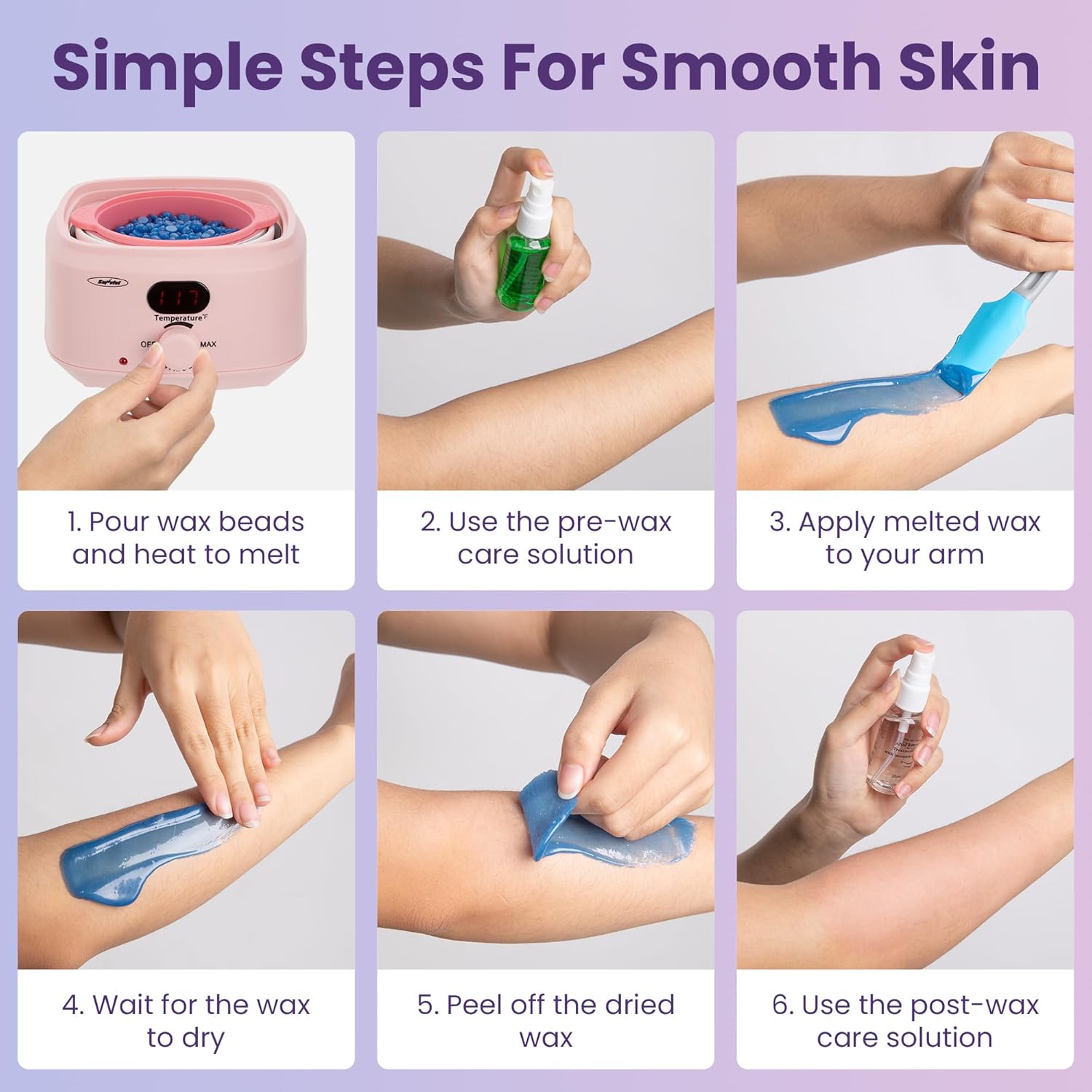 - Selected Wax Beads: Crafted from natural ingredients, our wax beads ensure a smooth, crack-free melt. Odorless and suitable for all skin types, including sensitive skin. Indulge in the joy of flaunting hair-free, silky-smooth skin, courtesy of the waxing experience.