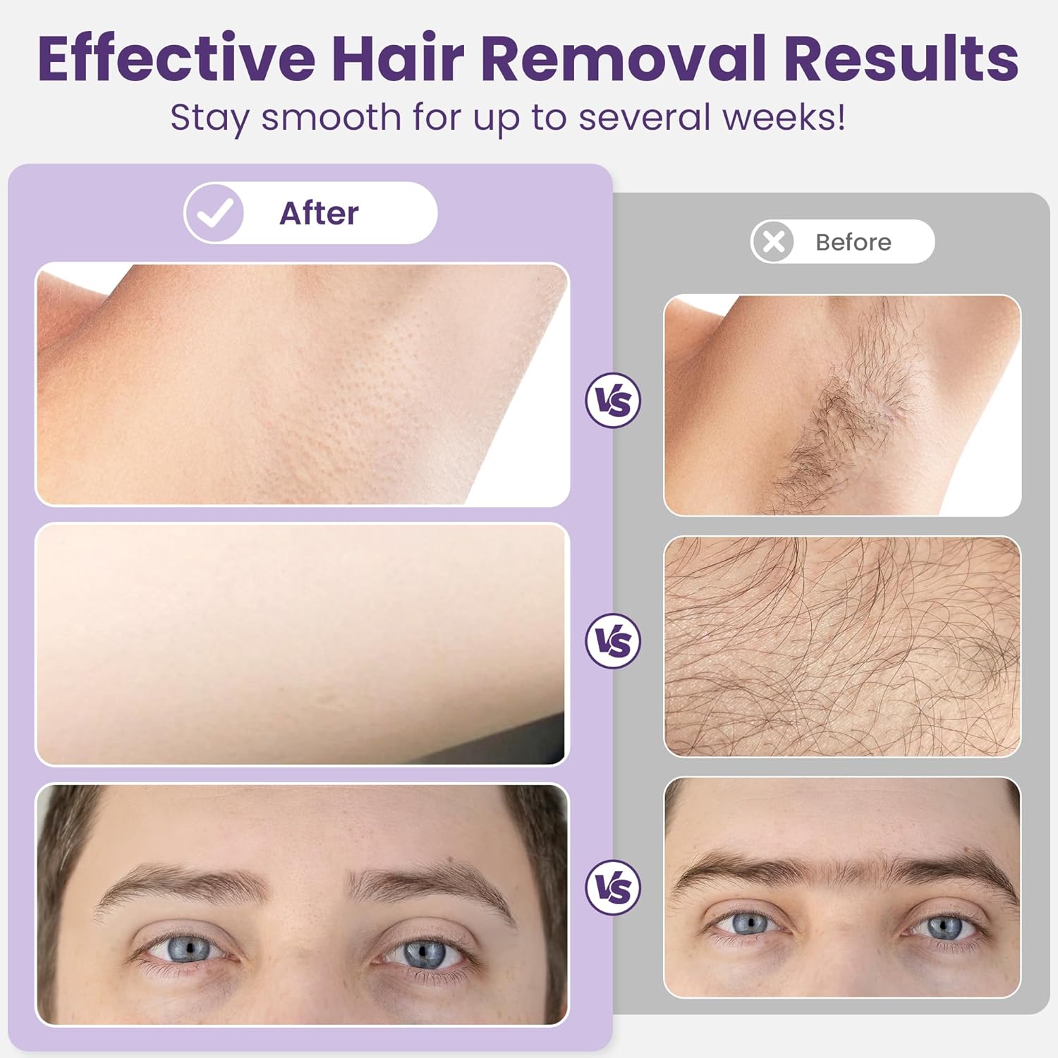 - Versatile Hair Removal: Achieve effective results on both coarse and fine hair in various areas, catering to full-body waxing needs. It's ideal for regions like underarms, legs, bikini area, face, eyebrows, and beard, providing a comprehensive hair removal solution.