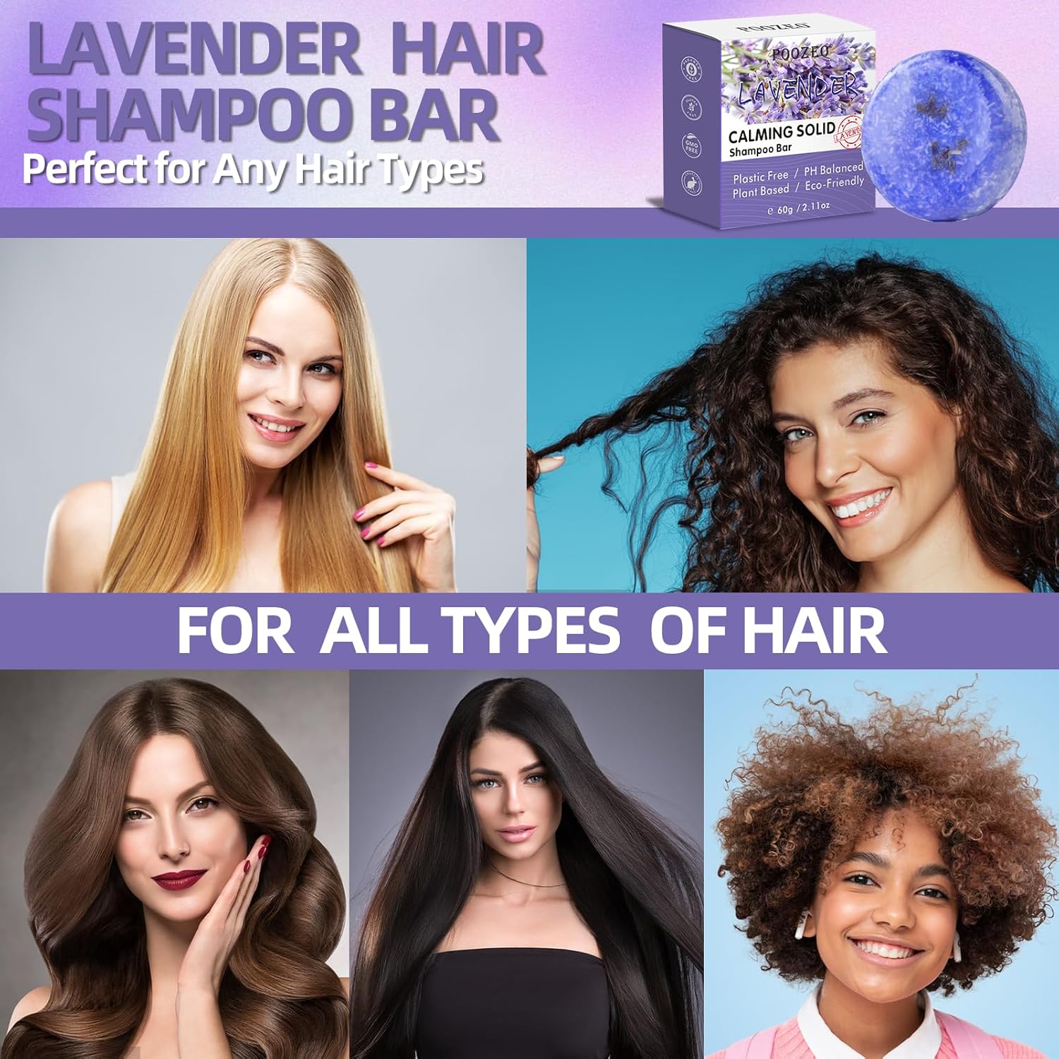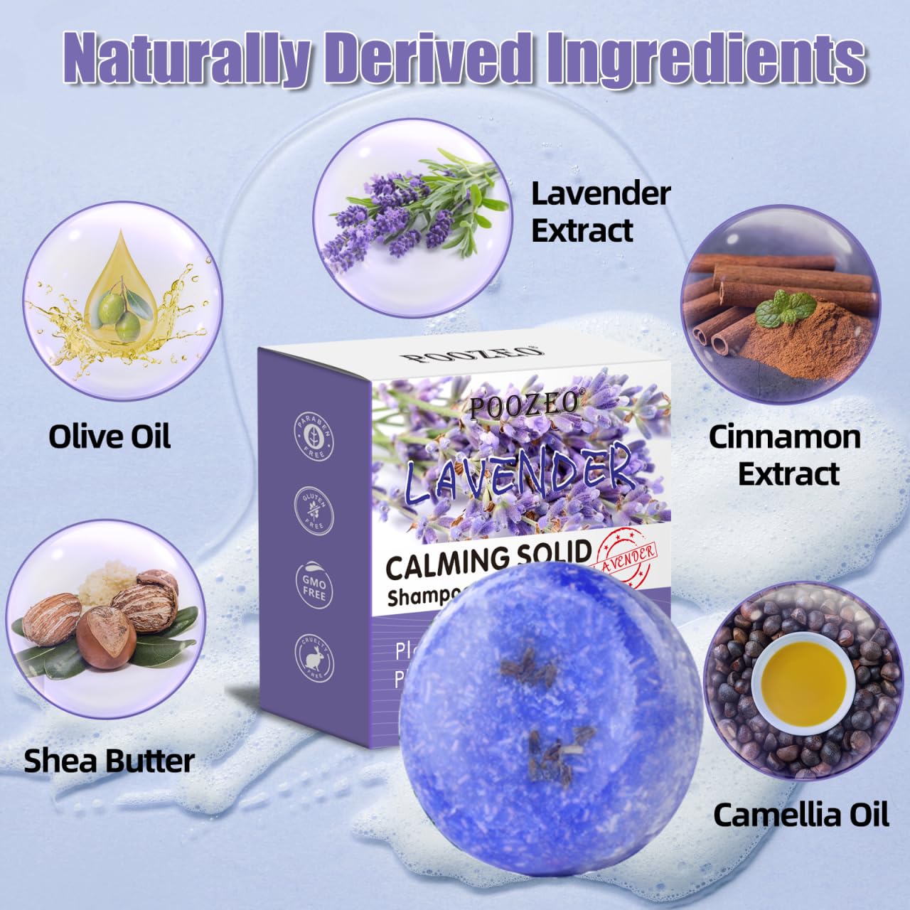 • LAVENDER SHAMPOO BAR: This shampoo bar contains rich lavender oil, lemon oil other plant essences to soothe the scalp, regulate the secretion of scalp oil, keep the scalp pores clean, help remove dandruff, and make the hair fresh, fluffy, healthy and shiny. It is suitable for neutral and oily hair!