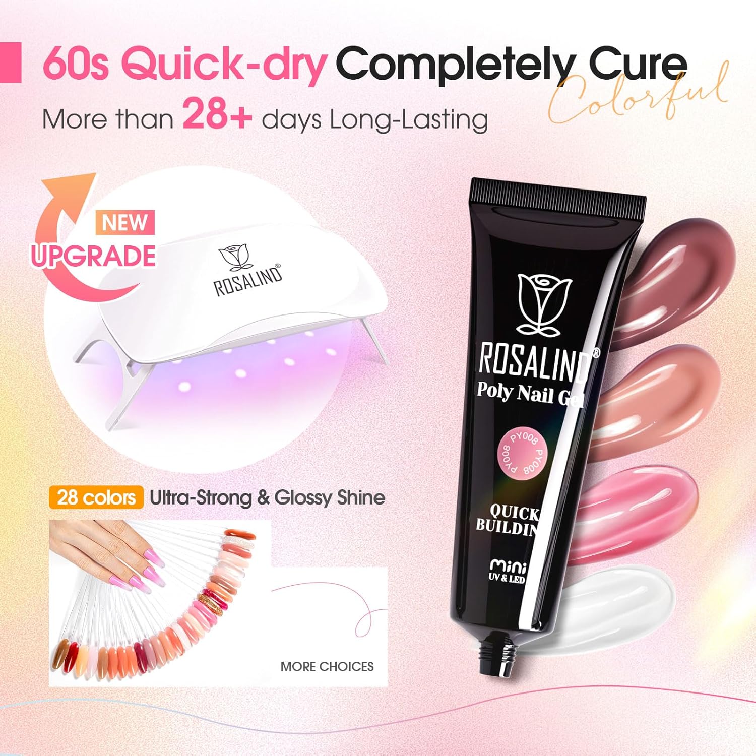 - Versatile Use: With 28 beautiful and trendy colors, ROSALIND poly nail extension gel kit is perfect for creating rhinestone nails, dry flower nails and glitter nails, as well as press-on nails on manicure. This poly extension gel is suitable for different shapes of nails such as square, oval, coffin and French nails!