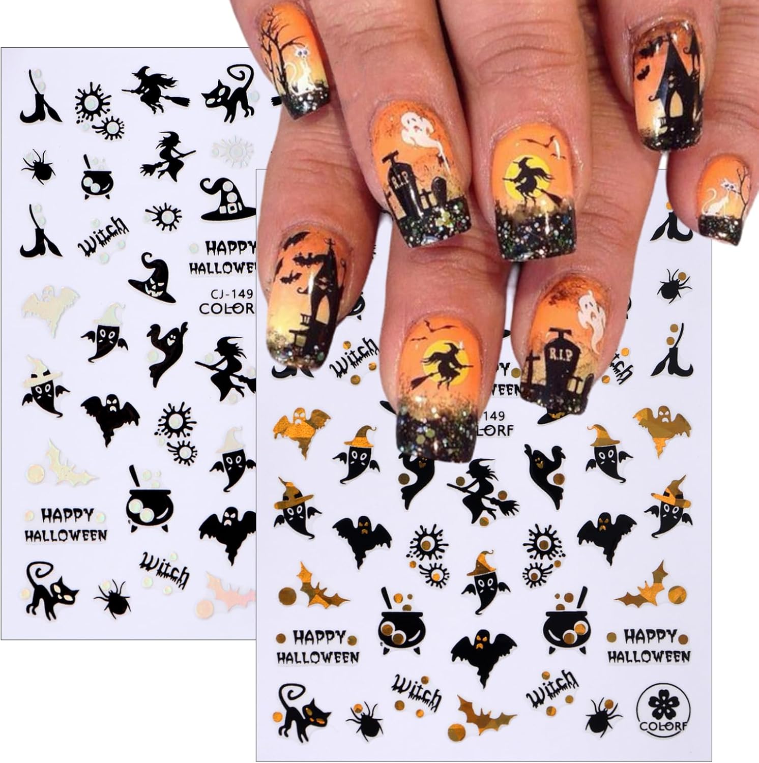 6 Sheets Halloween Nail Art Stickers 3D Horror Gothic Ghost Face Skull Pumpkin Bat Spider Witch Halloween Nail Decals Cute Cat Nail Art Design Accessories for Women Girl DIY Nail Decorations