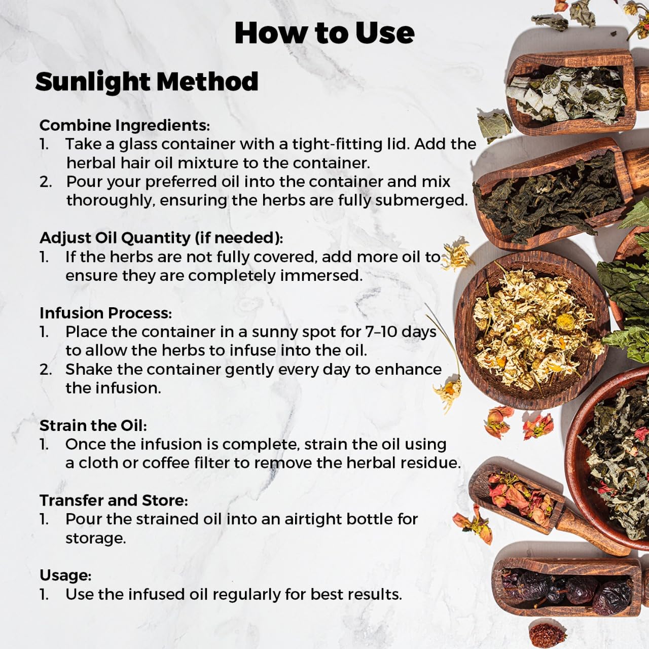 - Sunlight Method Uses: In a glass container with a tight-fitting lid,add 1 packet of our herbal hair oil mixture and your choice of oil.Mix well,making sure the herbs are completely covered.If needed,you can add more oil.Set the mixture aside in a sunny place for 7–10 days,allowing the herbs to infuse in the oil.If sunlight is not available use double boiler method.Once the oil is infused,you can strain it using a cloth or coffee filter. Store the oil in an airtight bottle and apply it regularly