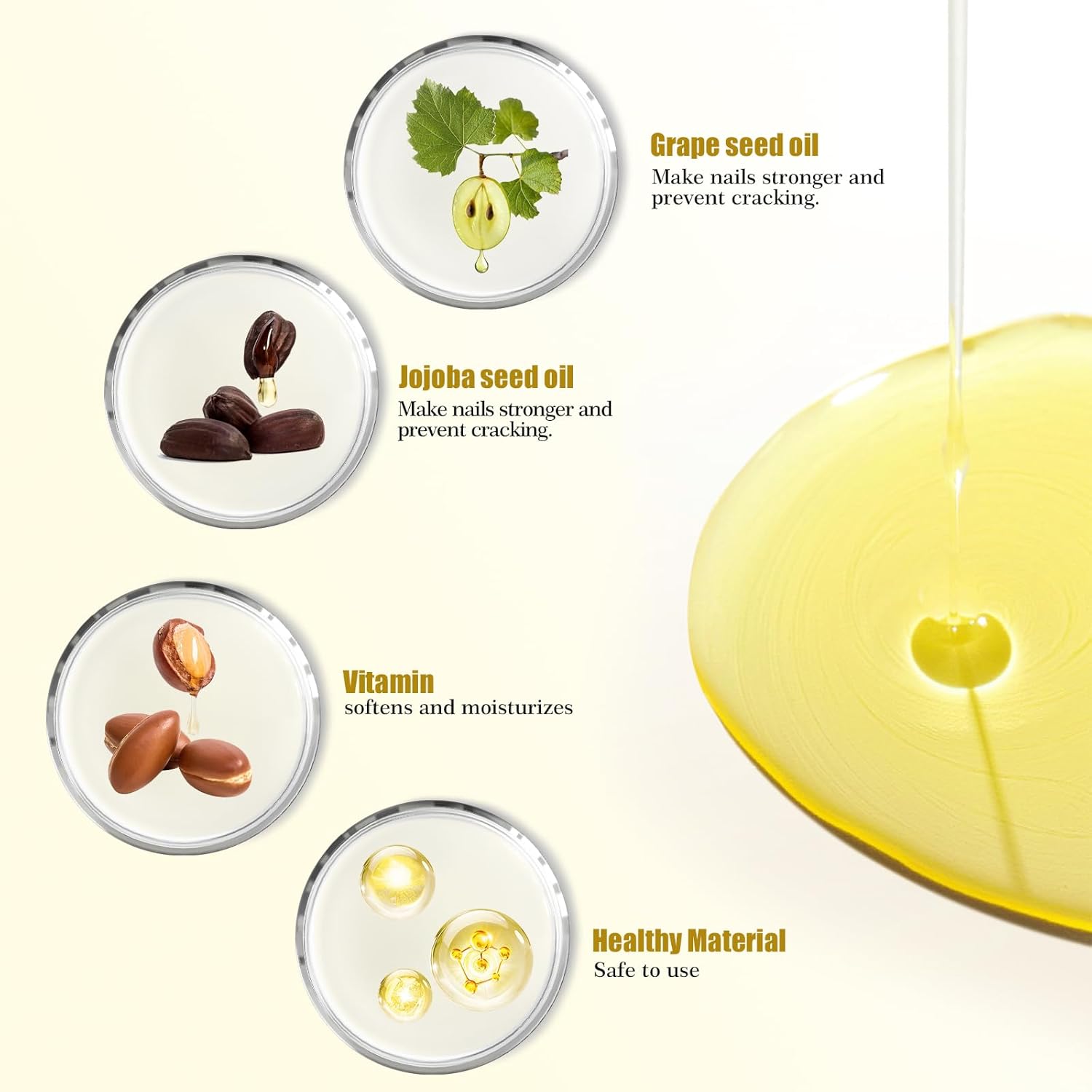 - 【Moisturizing】 Our Cuticle Oil for Nails and Toes is specially formulated to hydrate and relieve cuticles after manicure and pedicure procedures. Pure natural jojoba seed oil and grape seed oil extraction are both rich in vitamins and proteins. this cuticle oil deeply nourishes, leaving your cuticles soft and hydrated. Ideal for daily use, our cuticle oil helps prevent dryness and cracking, keeping your nails looking perfect and well-maintained.