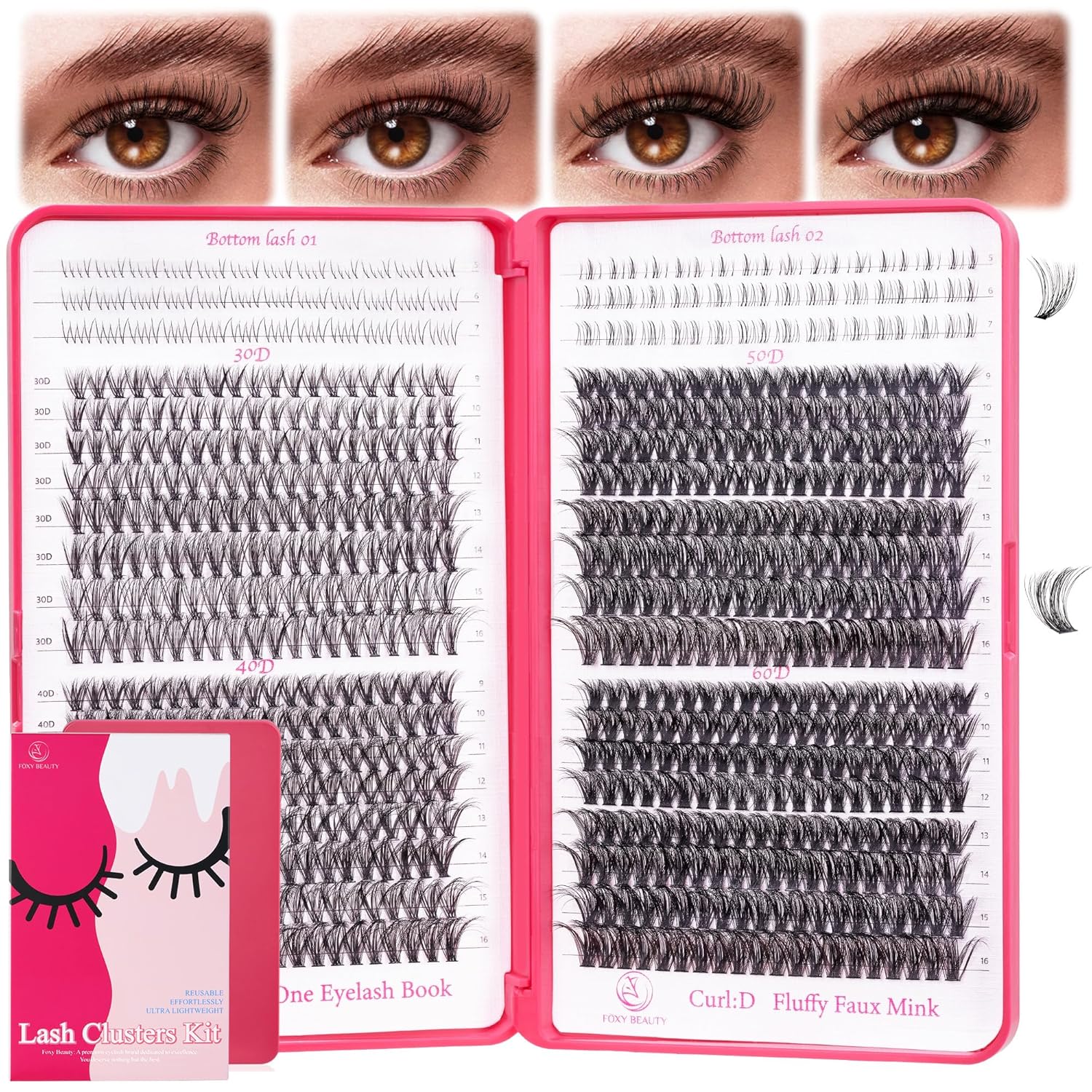 - Multi-Type Hybrid DIY Lash Tray:One lash tray is enough for you to use many times.Experience convenience and versatility with our lash box, you can create many different lash looks with one lash tray. Lashes contains 4 types Upper lash cluster : 30D+40D+50D+60D - 9-16MM mix. Bottom Lashes 01, 5-7MM mix and Bottom Lashes 02, 5-7MM mix