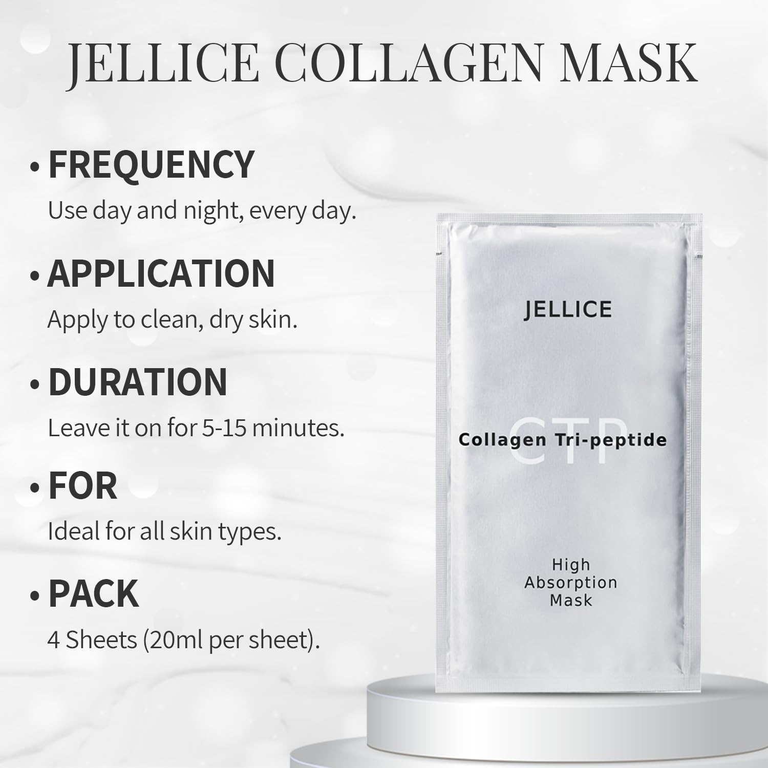 - This collagen mask for women provides hydration, creating a sensation as if the sheet face mask gently blends into the skin. Its light, breathable texture offers a comfortable and soothing experience