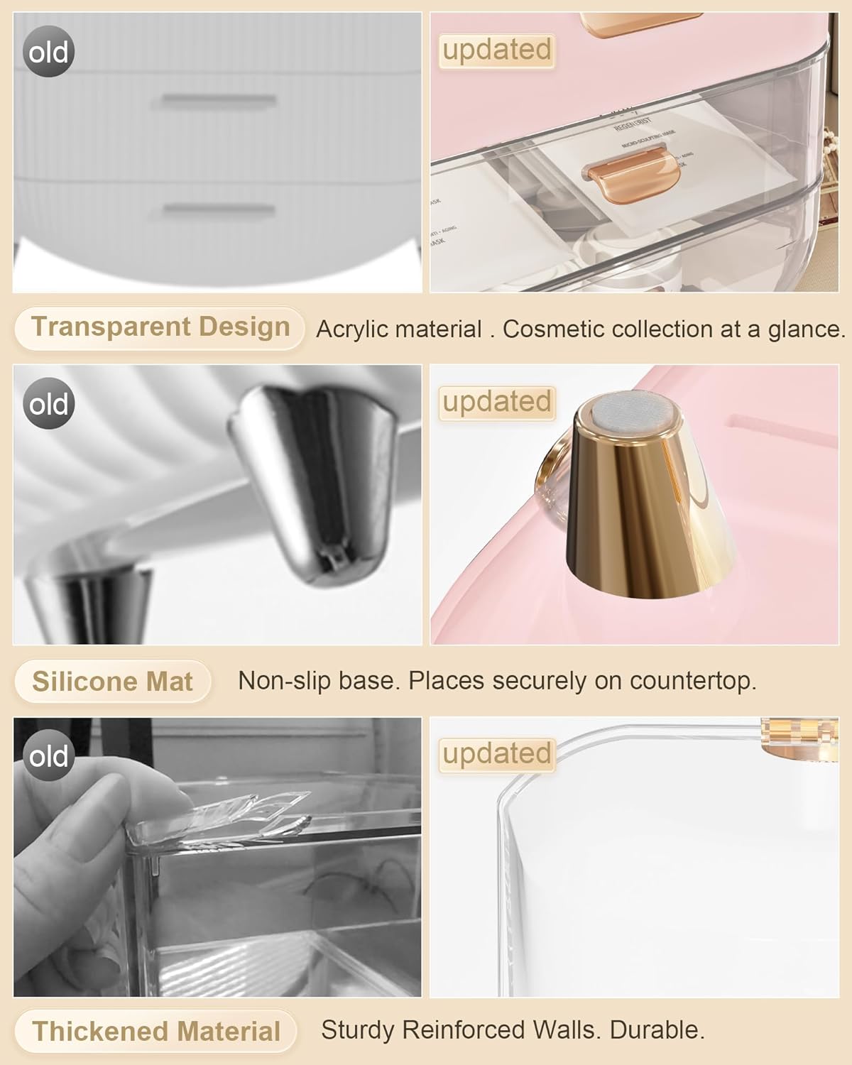 - 【Thickened Material & Non-slip】Reinforced and upgraded handle won't fall off. Easily move the skin care organizer to anywhere. The countertop organizer is made of thickened ABS material, which is stronger and more durable than normal ones. Drawer and clear top are able to open and close easily. Rubberized bottom, non-slip and won't scratch desktop.