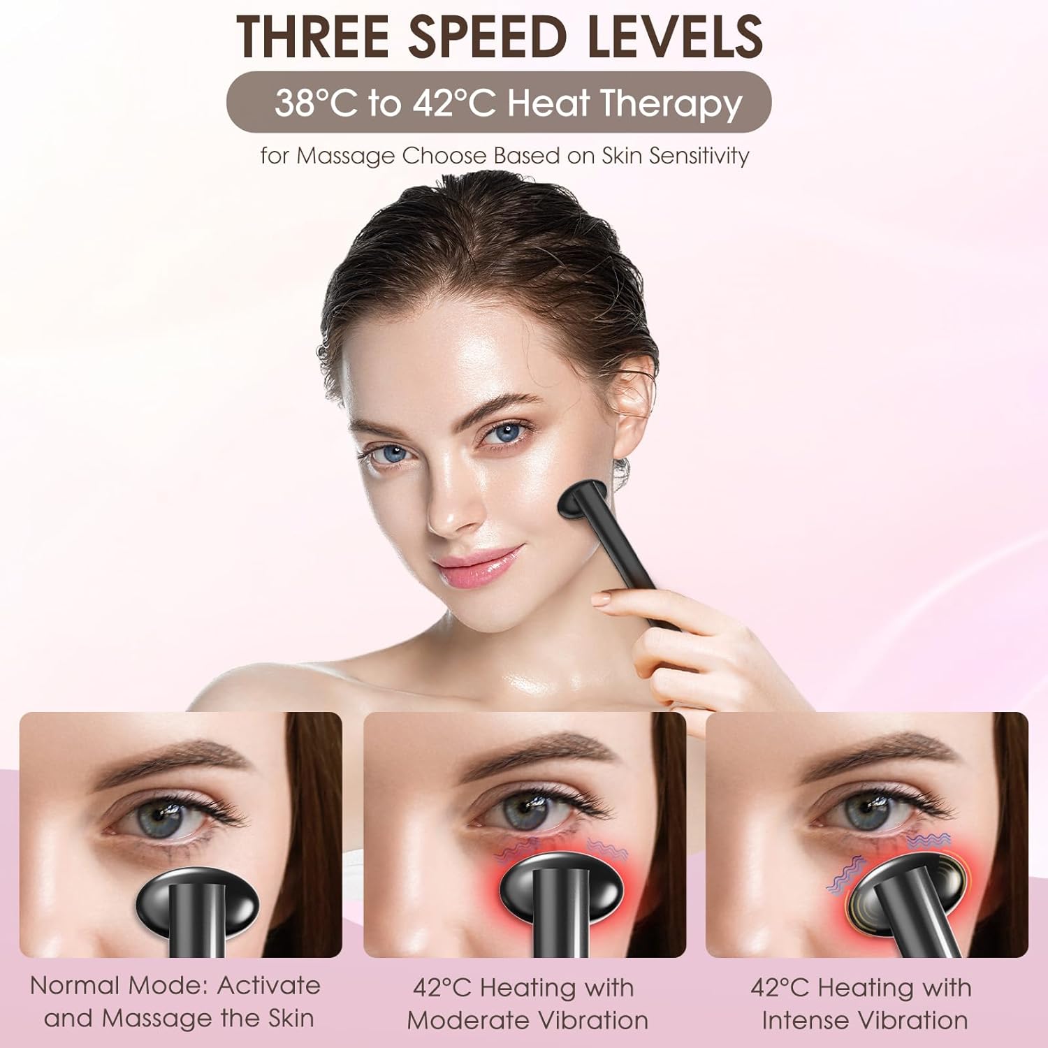 • Frequency Massage: The face light therapy device features three different frequency massage modes, combined with thermal therapy (38-42°C). Choose the appropriate frequency of massage based on skin tolerance, and promote skin absorption through massage to make the skin smooth, firm, and elastic.