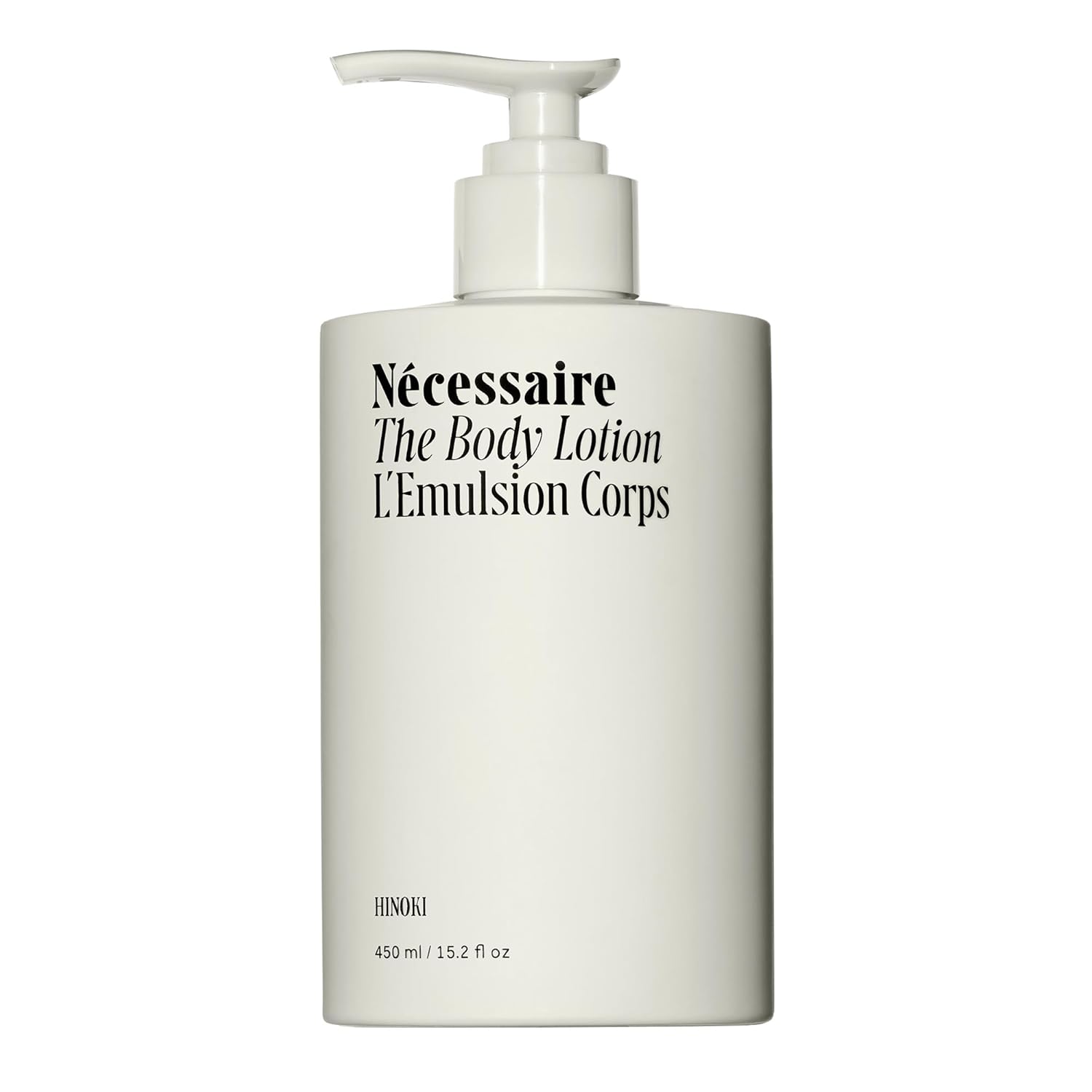 Nécessaire The Body Lotion with Pump. Hinoki. Multi-Peptide Firming Lotion to Moisturize, Firm, Strengthen. 2.5% Niacinamide, Vitamin C/E + Omega 6/9. 450ml / 15.2 fl oz