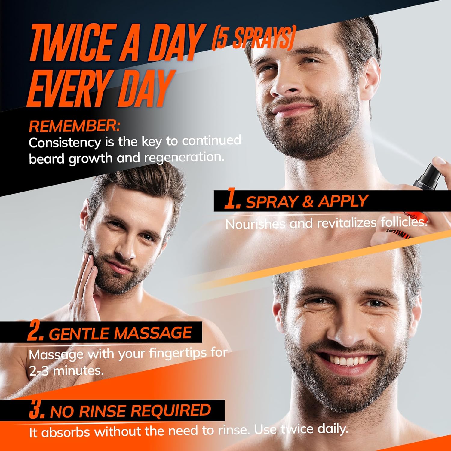 - Easy Application: For optimal results, simply spray the Beard Growth Serum onto the roots, massage gently until fully absorbed. Apply twice daily to a clean, dry beard for hydrated, soft, and nourished facial hair, supporting continuous growth.