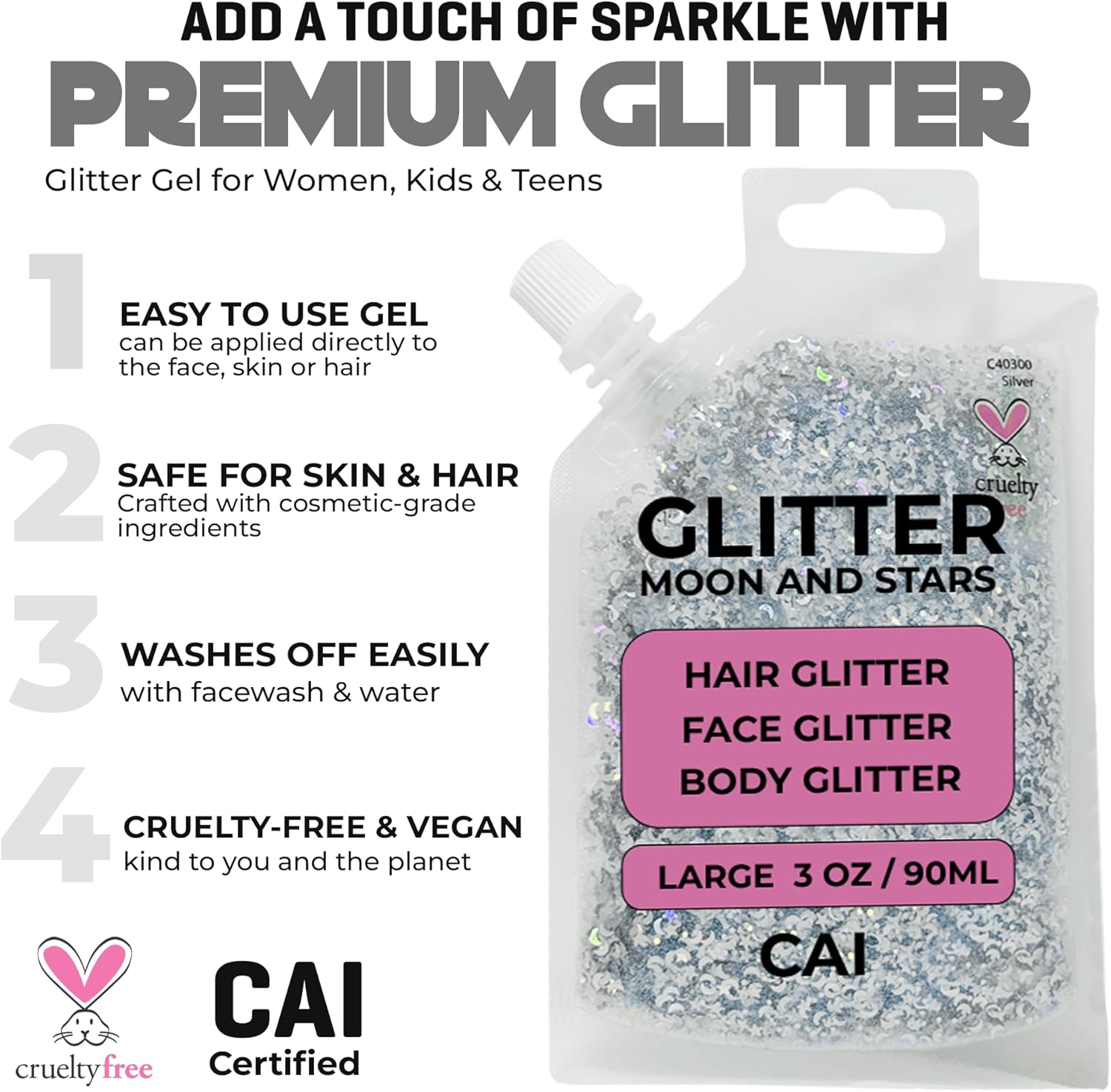 Face, Body & Hair Glitter Gel – Halloween Glitter for Kids and Women – 3 Oz Cosmetic-Grade Gel w/Moon & Stars for Festivals & Halloween Party, Easy Apply & Wash Off - Silver/Pink 2Pack
