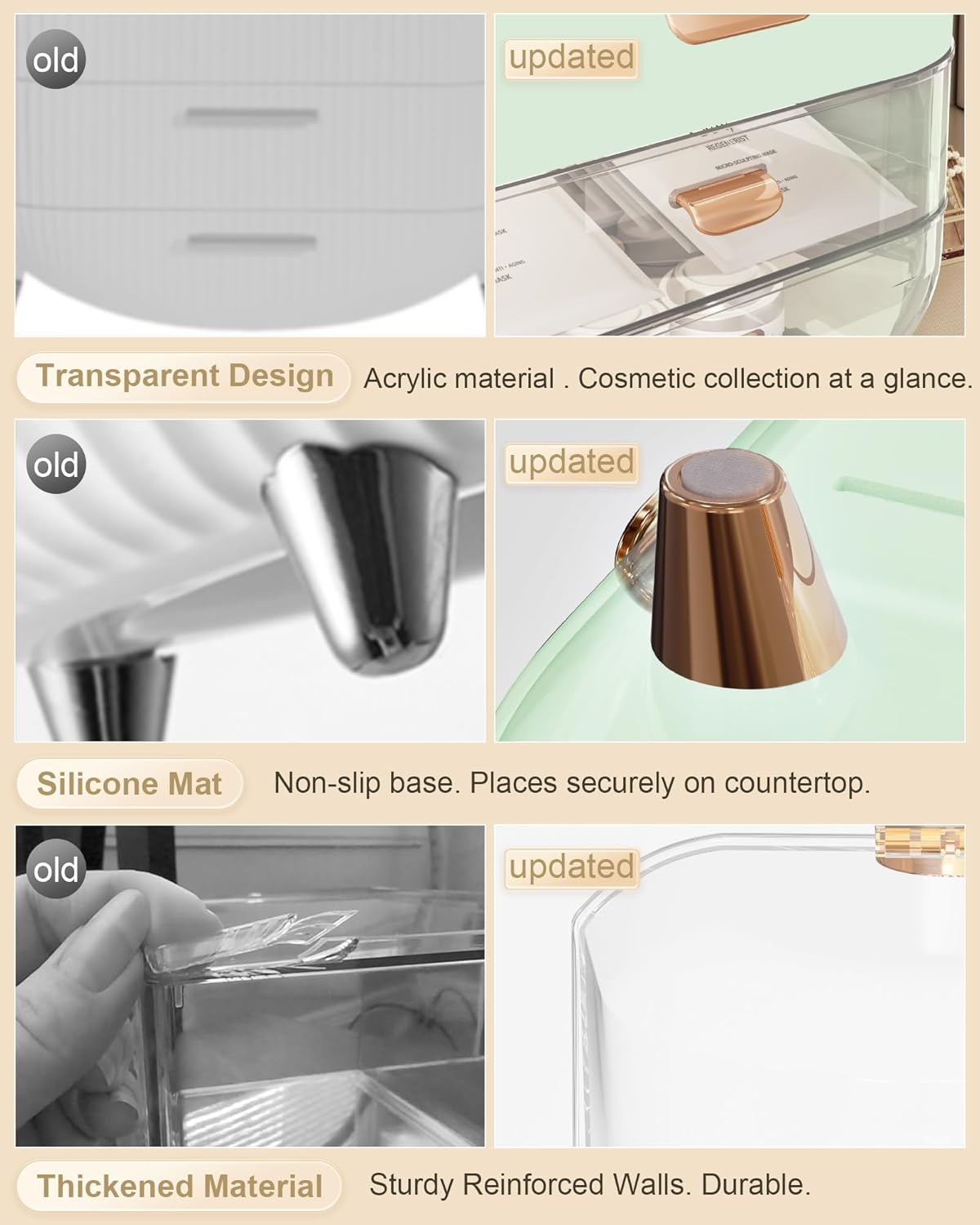 - 【Thickened Material & Non-slip】Reinforced and upgraded handle won't fall off. Easily move the skin care organizer to anywhere. The countertop organizer is made of thickened ABS material, which is stronger and more durable than normal ones. Drawer and clear top are able to open and close easily. Rubberized bottom, non-slip and won't scratch desktop.