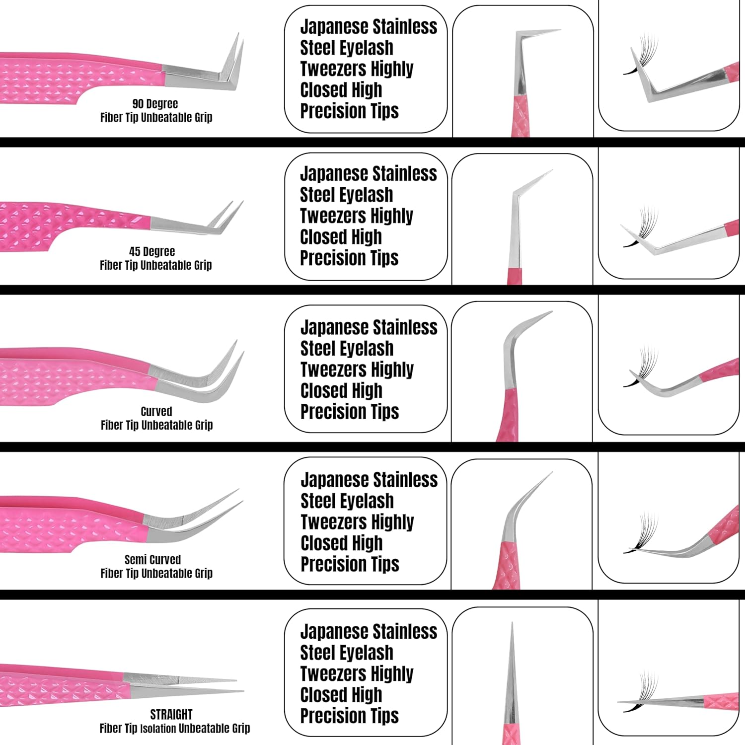 HADIZ Fiber Tip Eyelash Extension tweezers Lash Tweezer Japanese Steel set of five (Raspberry)