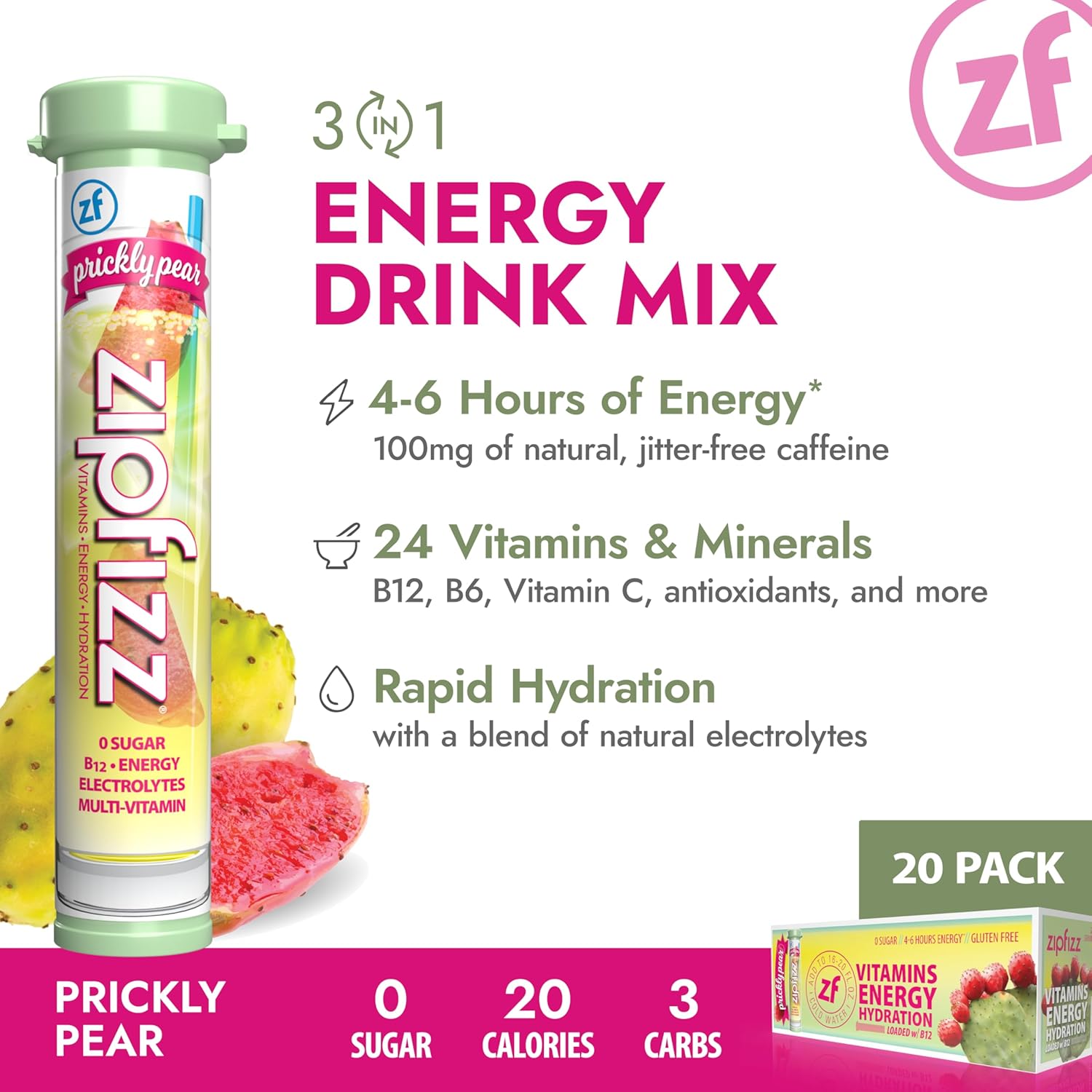 Zipfizz Daily Energy Drink Powder, Prickly Pear, 20 Pack | 3-in-1 Sustained Energy, Rapid Hydration, and Essential Vitamins | Sugar-Free | Electrolyte Powder | Contains Vitamin B-12 & Antioxidants