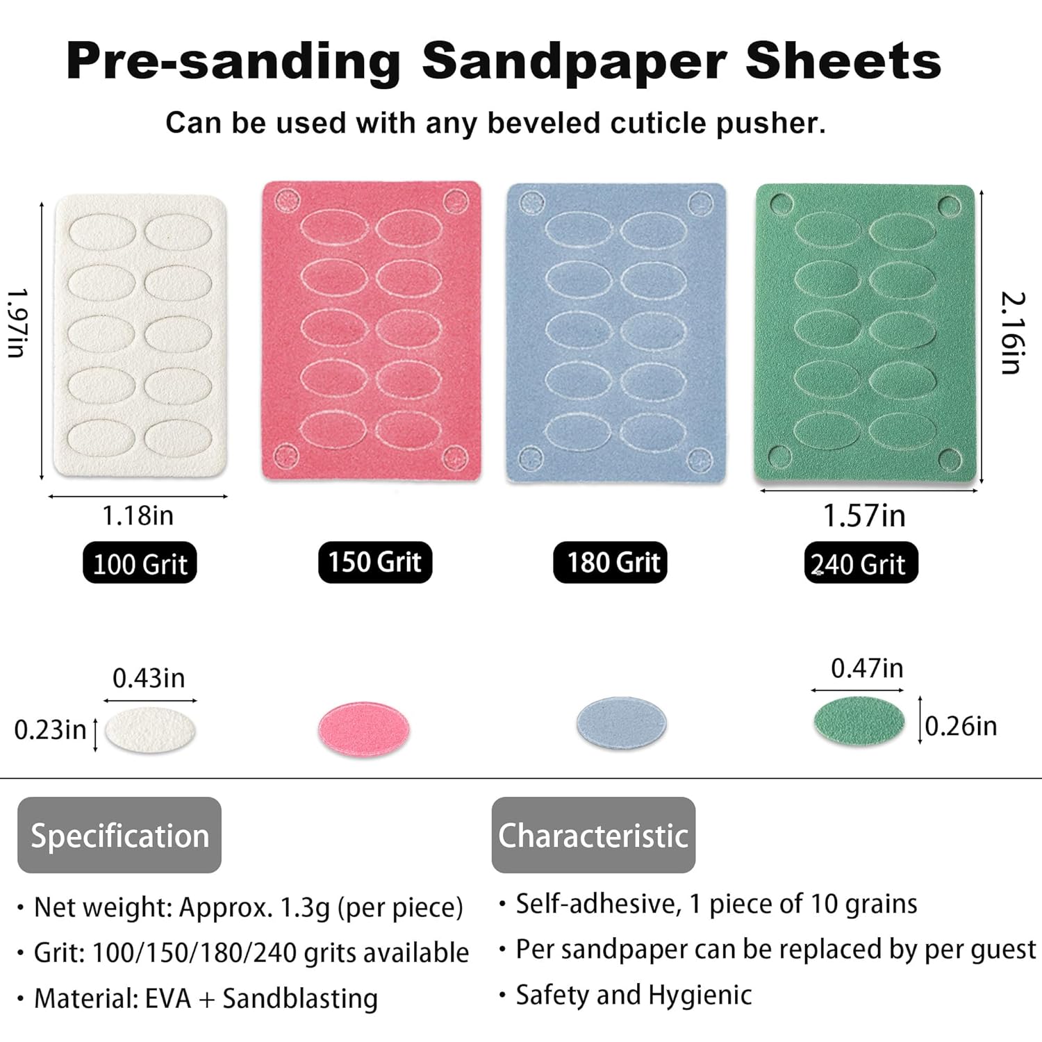 - Self-adhesive Mini Nail Files - The back of the nail file sandpaper is self-adhesive, very easy to use and replace, the mini sandpaper piece need to be used with cuticle pusher tool. These nail polishing sand papers are disposable, more healthy and hygienic.