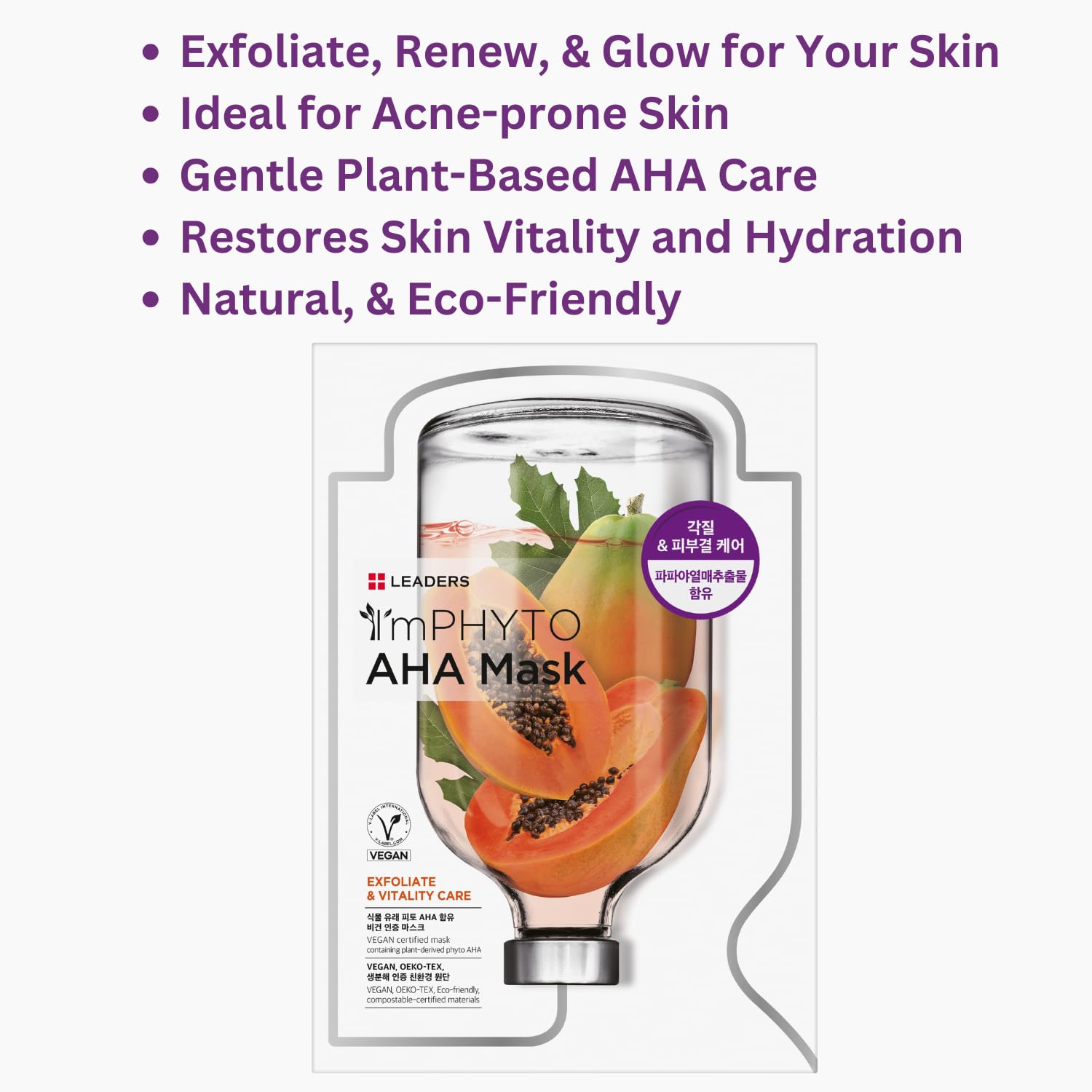I'MPHYTO Leaders Facial Mask 10 Sheet AHA Vegan Mask | Exfoliating& Vitality Skin Care | Plant-Derived Ingredients | Papaya Fruit Extract | Certified Vegan | Natural Cellulose Sheet
