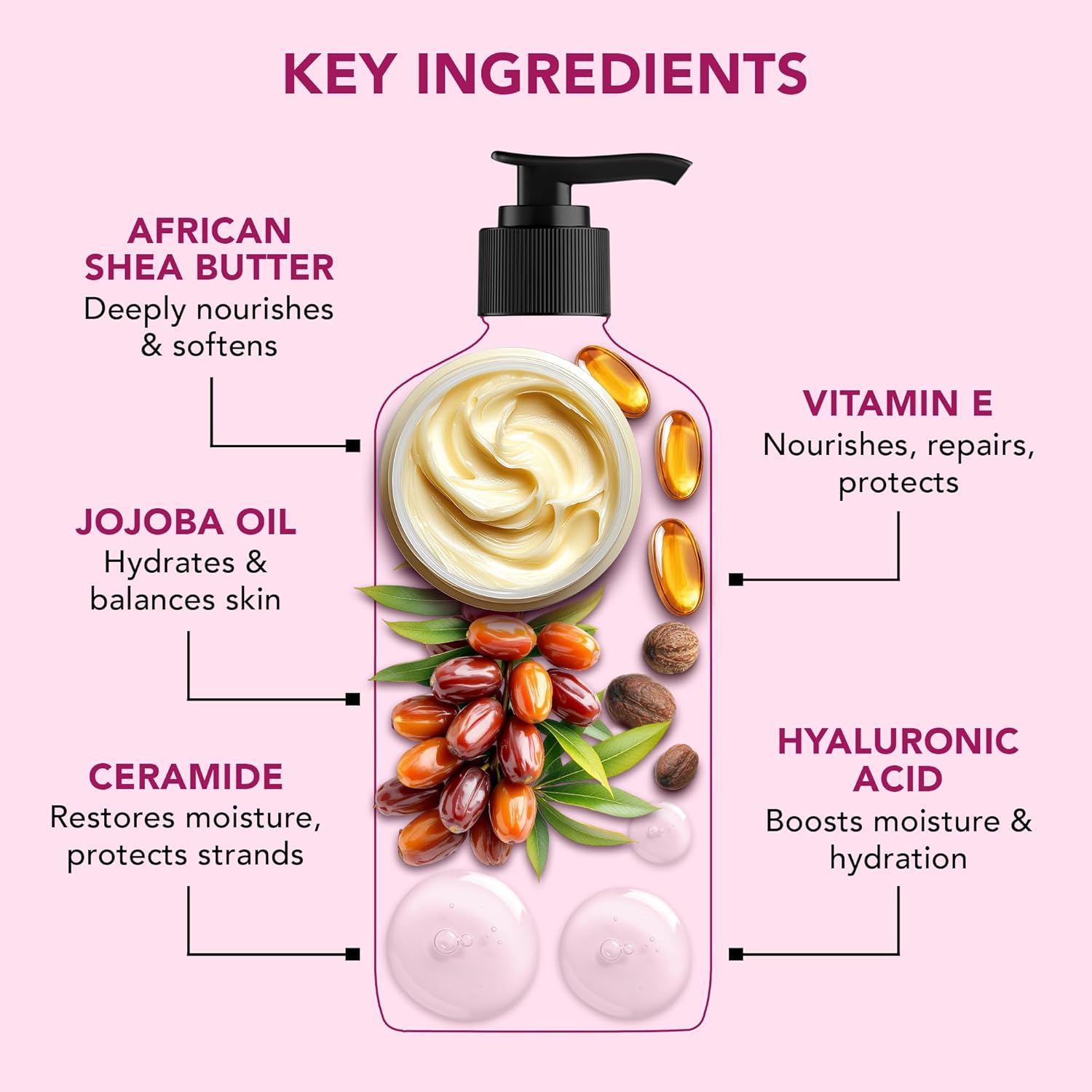- Shields Hair from Environmental Damage – Vitamin E and Ceramides create a protective barrier around each strand, defending against pollution, heat, and oxidative stress.